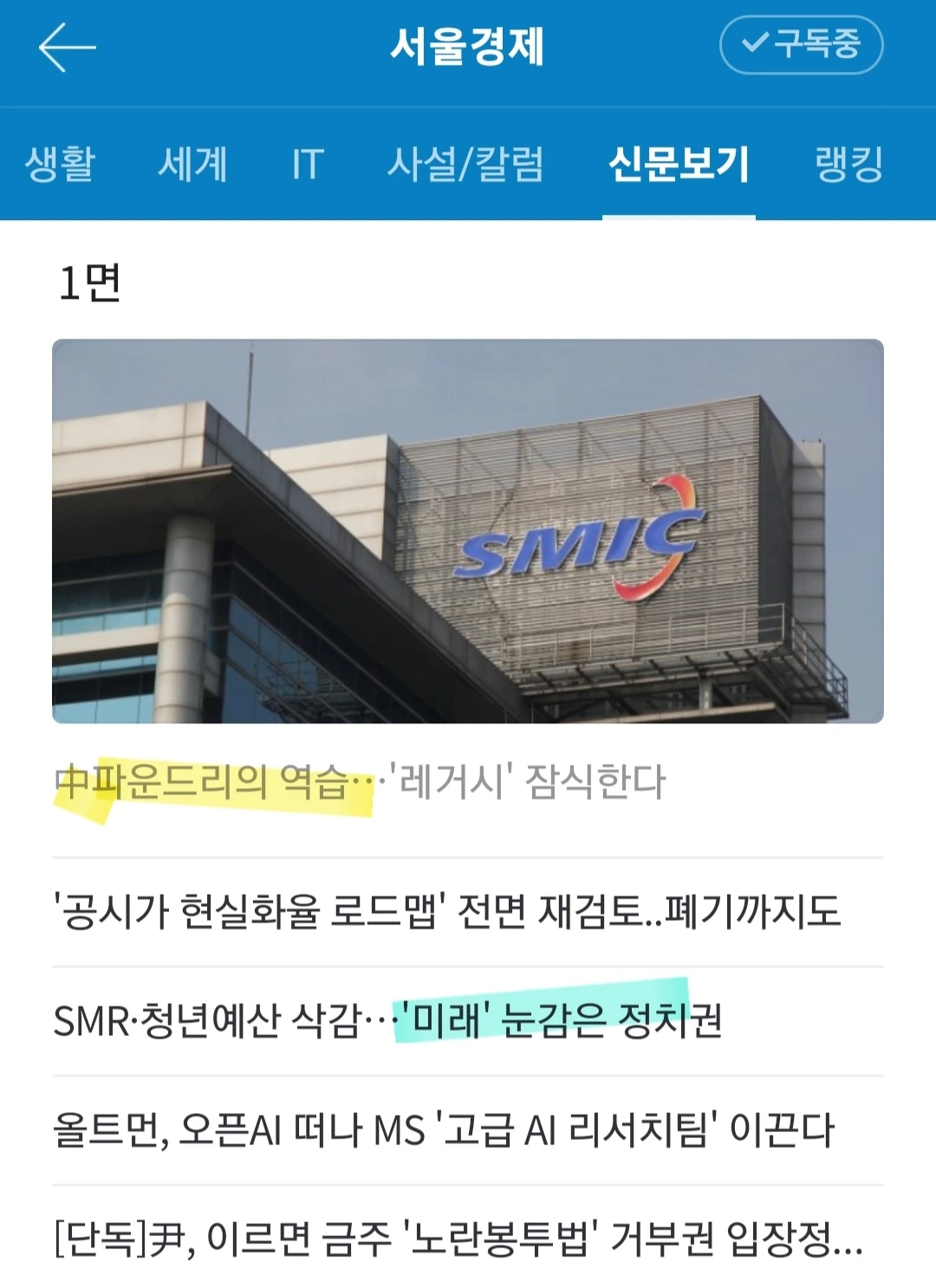 [요약] 중국 파운드리(반도체 위탁 생산) 업계가 미국의 고강도 기술 제재 속에서도 오히려 생산 능력 확대. 삼성전자나 TSMC가 개발하는 최선단 공정을 따라잡지는 못해도 ‘알짜’로 꼽히는 레거시(구형) 7㎚(나노미터·10억 분의 1m) 이상 시장에서 영향력을 키워 파운드리 생태계를 장악하려는 전략 / 한때 1위를 질주하다 시장을 내준 디스플레이나 배터리처럼 반도체마저 중국에 주도권을 내주는 것 아니냐는 우려