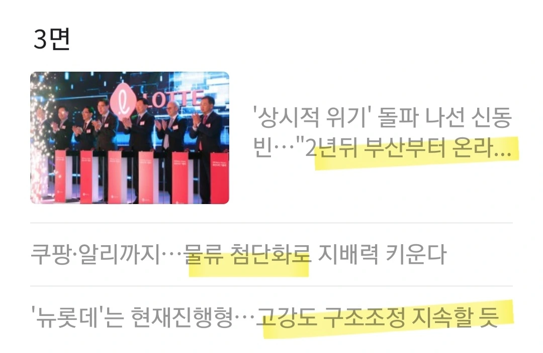 [현재 롯데 위상] 상시적 위기 환경에서 살아남기 위한 결단// 한때 ‘유통 공룡’이라고 불릴 정도로 시장 내 위상이 절대적/ 오프라인에서 온라인으로 옮겨가면서 롯데의 입지는 위협받고 있는 실정 /