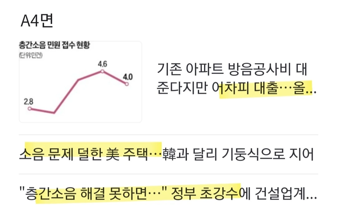 [건설사] 대형 건설사 관계자는 “층간 소음을 줄이기 위해 현재보다 좋은 보강재를 사용하거나 신기술 공법을 적용하면 공사비 증액은 불가피하다”며 “원자재값과 임금 상승 등으로 이미 큰 폭으로 오른 공사비가 더 상승할 요인으로 작용할 것”또 “손해배상할 경우 어떻게 할지 아직 결론이 나지 않은 상황에서 성급하게 대책을 발표한 느낌을 지울 수 없다”고 했다.