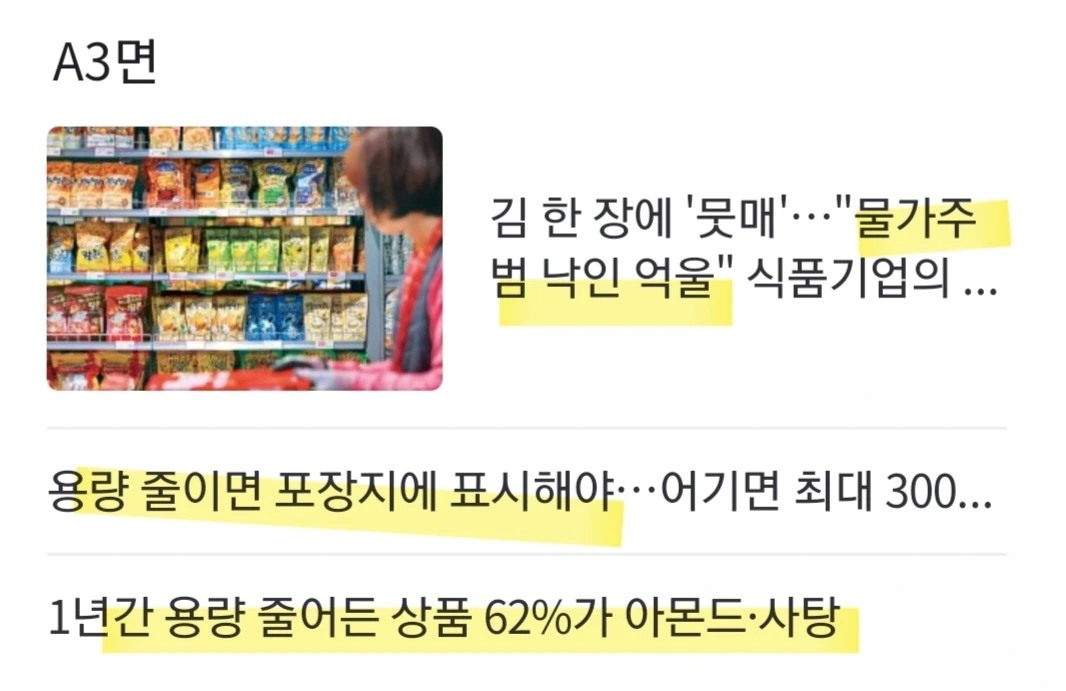 [요약] 기업이 가격을 놔둔 채 제품 용량을 줄이는 경우 포장에 표시하도록 의무화하고 위반 시 최대 3000만원의 과태료를 물리기로. ‘슈링크플레이션’을 막기 위해서. / 하지만 원재료값이 오르는 상황에서 정부의 인위적인 물가 억제가 슈링크플레이션을 부추기는 사실은 외면한 채 ‘기업 때리기’만 하는 것 아니냐는 지적