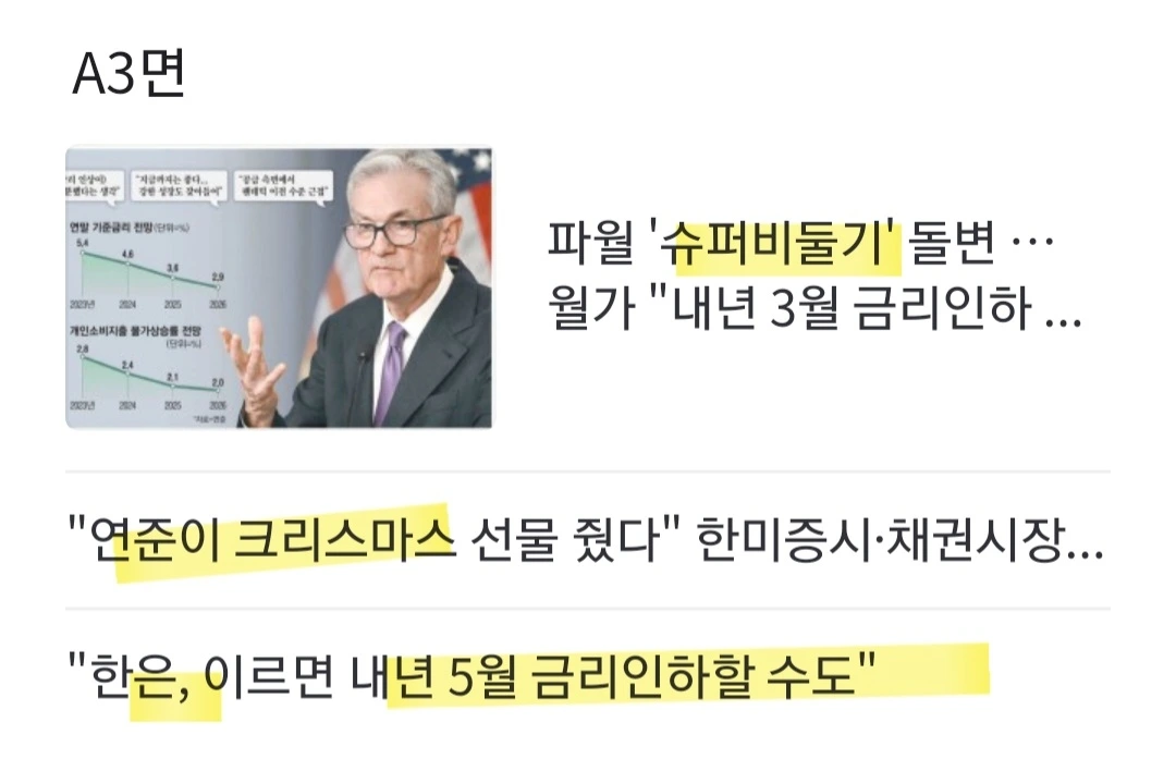 [환율] 원화값 급등. 전일 보다 24.5원 오른 1295.4원. 시장 예상보다 강한 비둘기파적 입장을 보이면서 달러화가 급락하며 원화 강세가 나타났다는 분석. / "미 연준이 시장에 크리스마스 선물을 미리 줬다"며 "고금리 상품에 예치된 자금이 채권이나 주식으로 이동하는 머니무브 현상이 두드러지고, 이는 달러화의 추가 약세 압력으로 작용할 것"