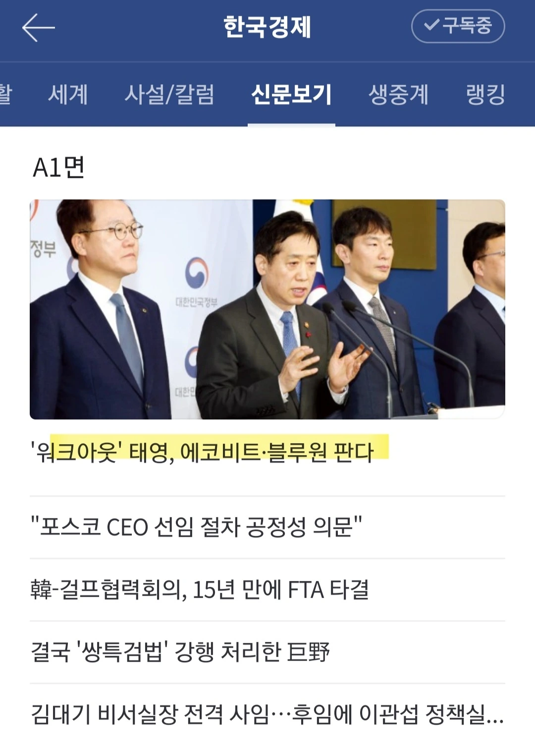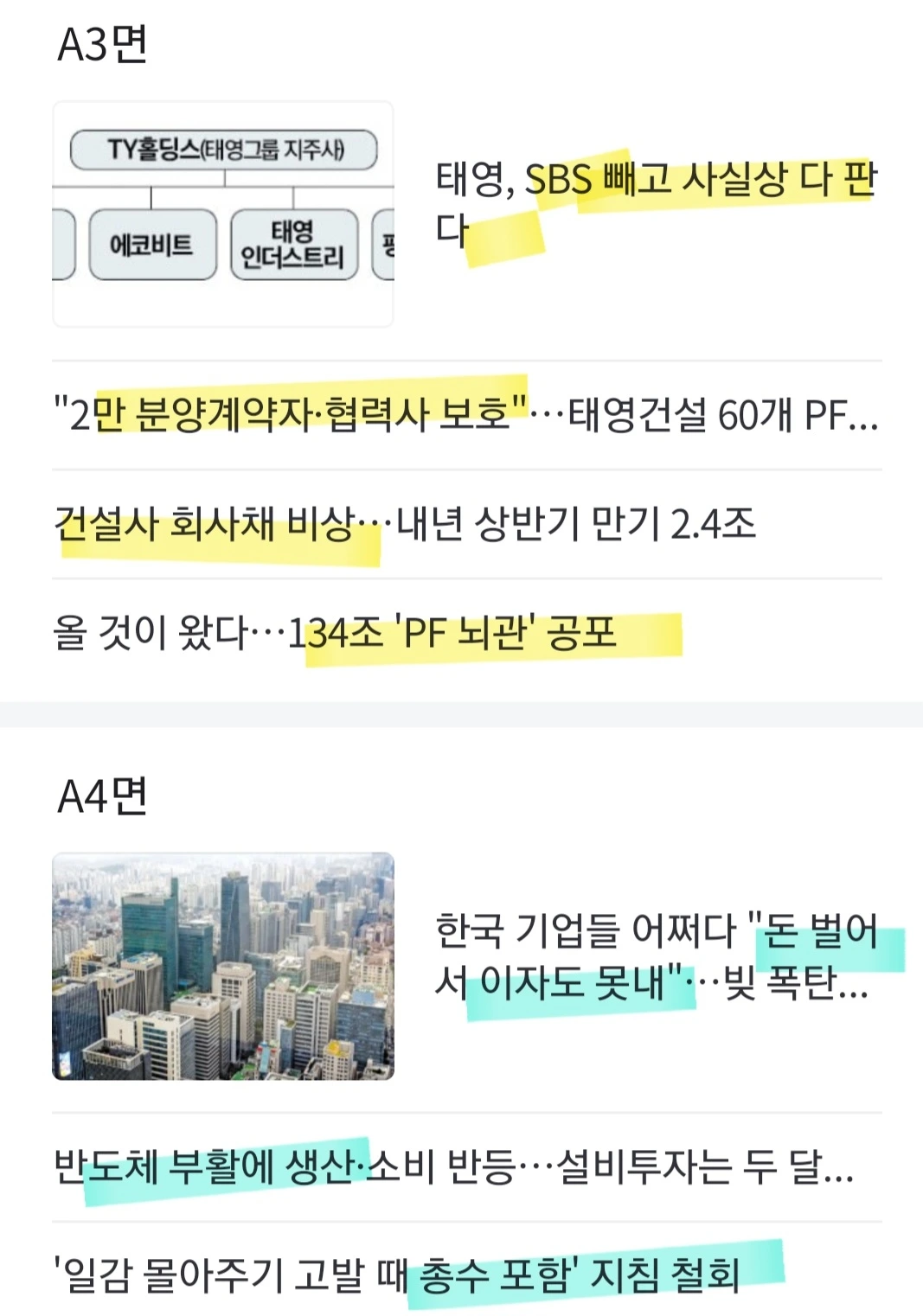 [일어난 일] 부동산PF 대출로 위기에 빠진 태영건설이 28일 워크아웃(기업구조개선작업)을 신청. / 태영그룹은 기업 가치를 3조원대로 평가받는 최대 알짜 계열사인 에코비트(종합환경업체) 매각 등 추가 자구책을 마련. 워크아웃 성공 여부가 충분한 자구 노력에 달렸기 때문