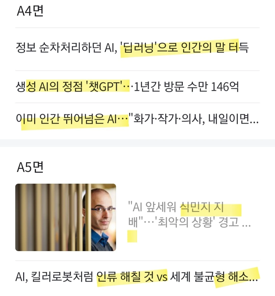 [하라리 인터뷰] “지금껏 발명된 모든 기술·도구와 AI는 차원이 다르다”. “인류는 역사상 처음으로 20년 뒤 인간 사회가 어떤 모습일지 전혀 알 수 없게 됐다”. “인간의 예측을 벗어난 AI는 인공(artificial)보다는 외계(alien) 지능에 가깝다”. “인류 중에 5000년에 걸친 농업혁명의 전 과정을 살아서 지켜본 사람은 아무도 없습니다. 하지만 AI 혁명은 5년, 길어야 50년 안에 진행될 겁니다. 지금의 아이들이 80세가 되면 세상은 오늘날과 완전히 다를 겁니다. 그게 제가 AI가 가져올 미래에 대해 확신할 수 있는 유일한 사실입니다.”