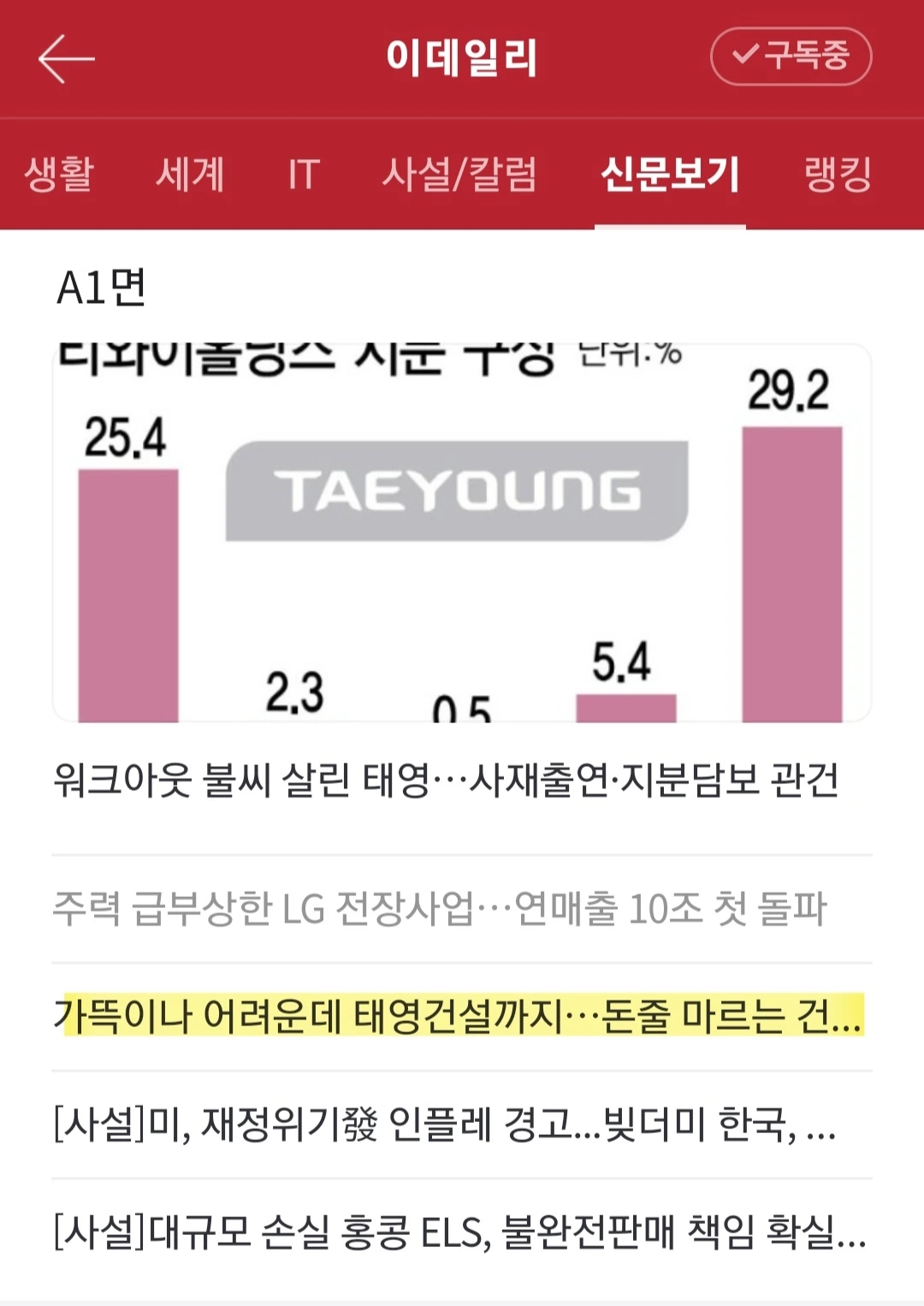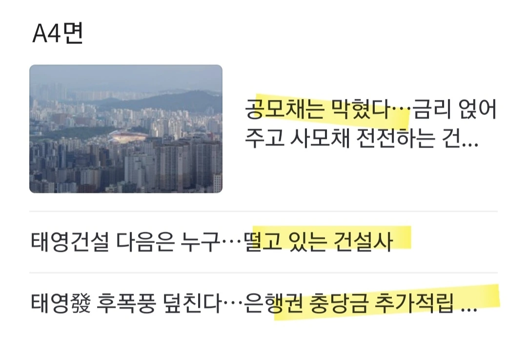 [요약] 건설사들의 돈가뭄이 갈수록 심화. 부동산 경기 침체와 고금리로 자금 조달에 어려움을 겪고 있던 와중에 태영건설사태까지 더해진 영향 / 대부분 건설사들은 공모채 발행을 시도조차 하지 못한 채 사모채 시장이나 단기 자금 시장을 통해 간신히 자금을 수혈. 올해 상반기 만기가 도래하는 건설사 기업어음(CP)과 회사채 규모가 3조원을 넘어서는 것으로 건설사 줄도산 우려