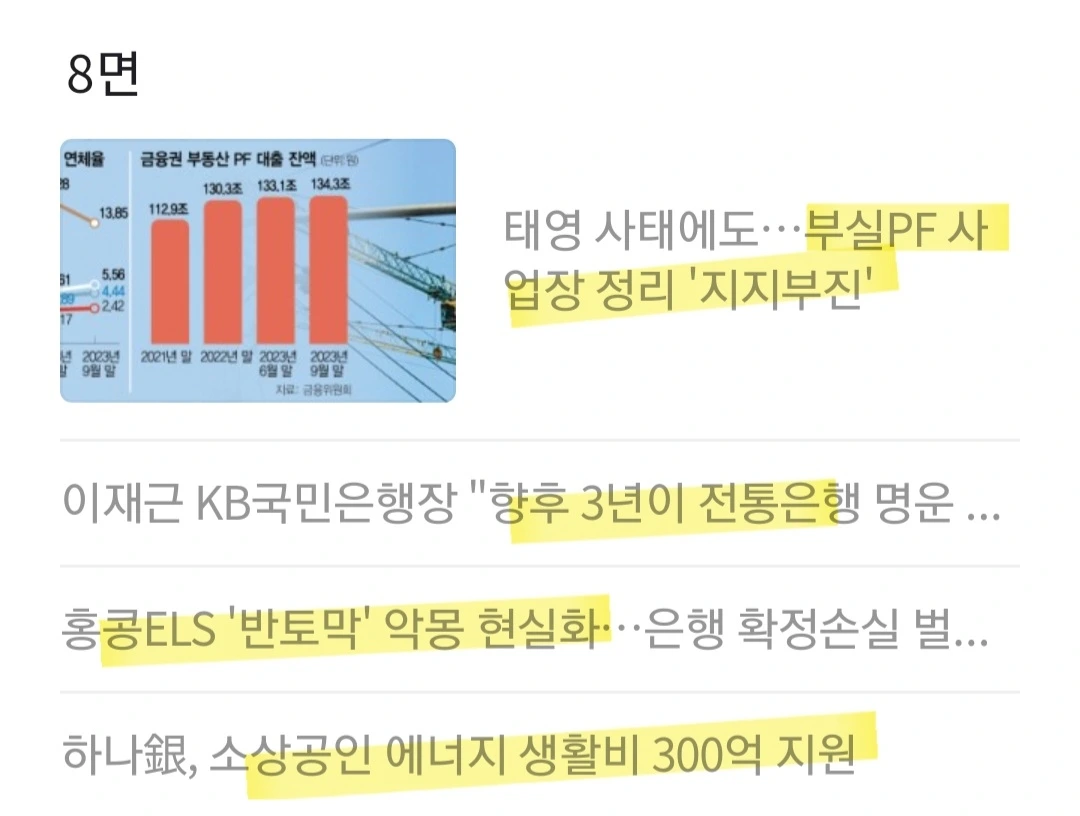 [PF] 부실 사업장 정리에 좀처럼 속도가 붙지 않고 있다. 1) 부실 PF 사업장 정상화 펀드 자금 활용 전 2) 부실 PF 사업장 분류도 제대로 이뤄지지 못하고 있기 때문. 태영건설 워크아웃(기업 개선 작업) 여파로 만기 연장에 실패하는 사업장이 대거 등장하면 손실을 이연해온 대주단, 즉 금융회사의 손실 규모가 더 커질 것으로 우려. 금융권 “그나마 만기를 연장했던 사업장들의 만기가 이제 또 돌아올 텐데 태영건설 사태로 연장은 점점 어려워질것 "