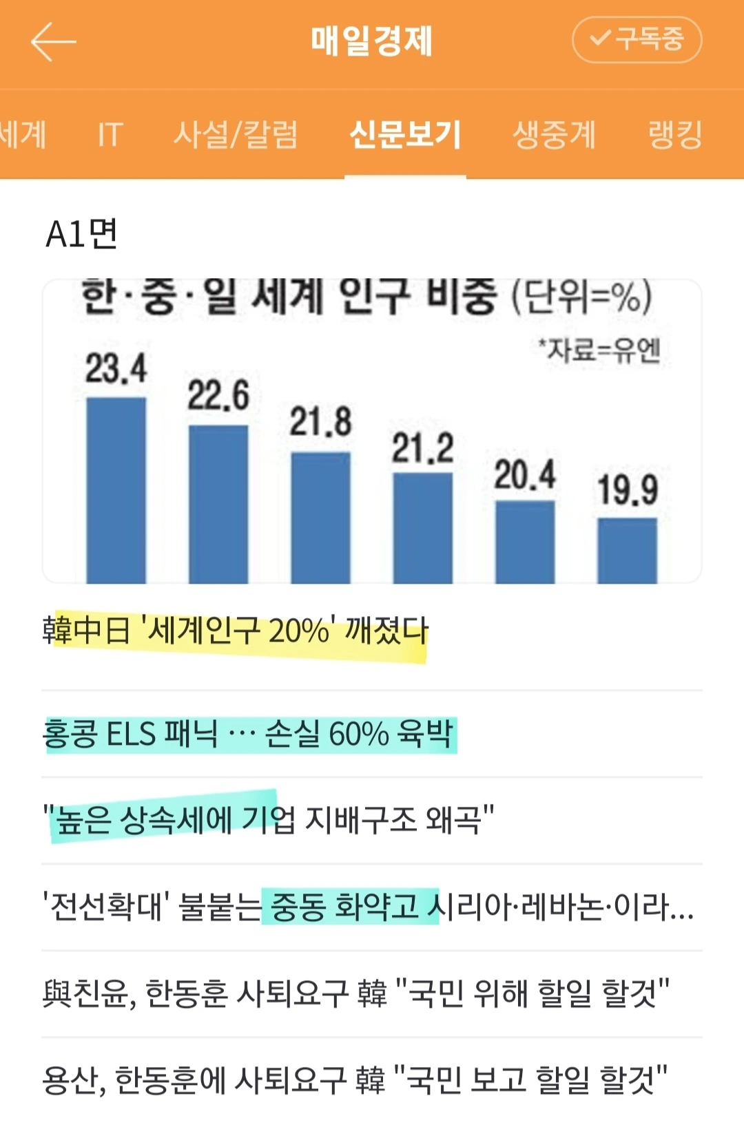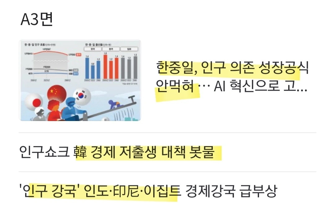 한·중·일 3국이 세계 인구에서 차지하는 비중이 처음으로 20% 아래로 떨어지면서 인구 비상. 한국·일본의 기술력, 중국의 값싼 노동력과 풍부한 내수 시장으로 시너지 효과를 냈던 한·중·일 경제권에 닥친 최대 위기. 한·중·일이 로봇, 인공지능(AI) 기술 등으로 생산성을 끌어올리고 교역 시장을 다변화하면서 기존 성장 공식을 전면 개편해야 한다는 지적.
