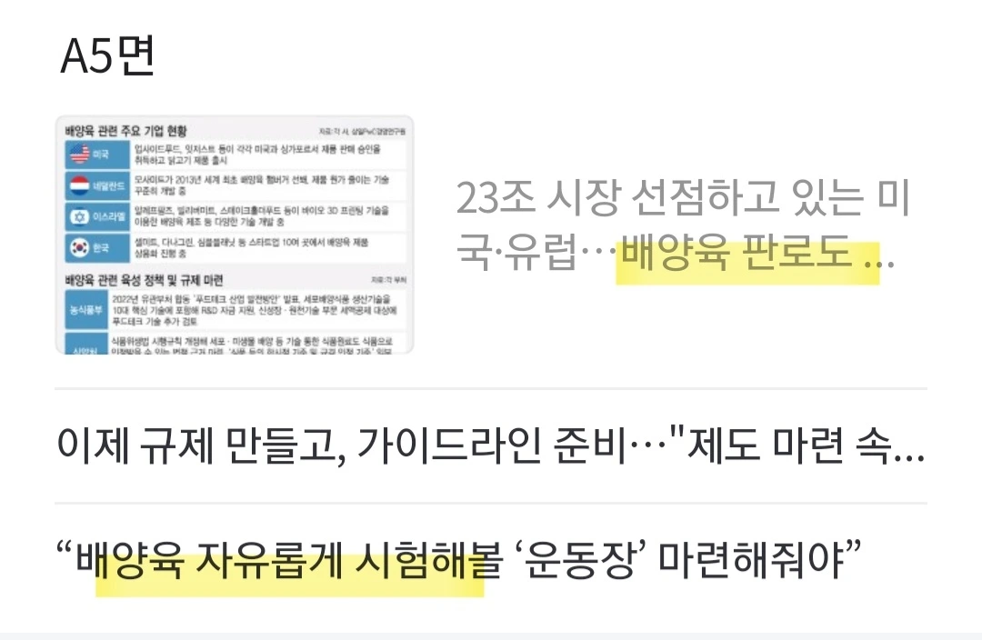 [정책지원] 농림축산식품부는 지난해 12월 과학기술정보통신부·산업통상자원부·중소벤처기업부 등과 함께 ‘푸드테크 산업 발전방안’을 발표. 배양육 등 대체식품 육성을 위한 자금 지원, 시장 확대, R&D 지원, 제도 정비 등의 다양한 정책