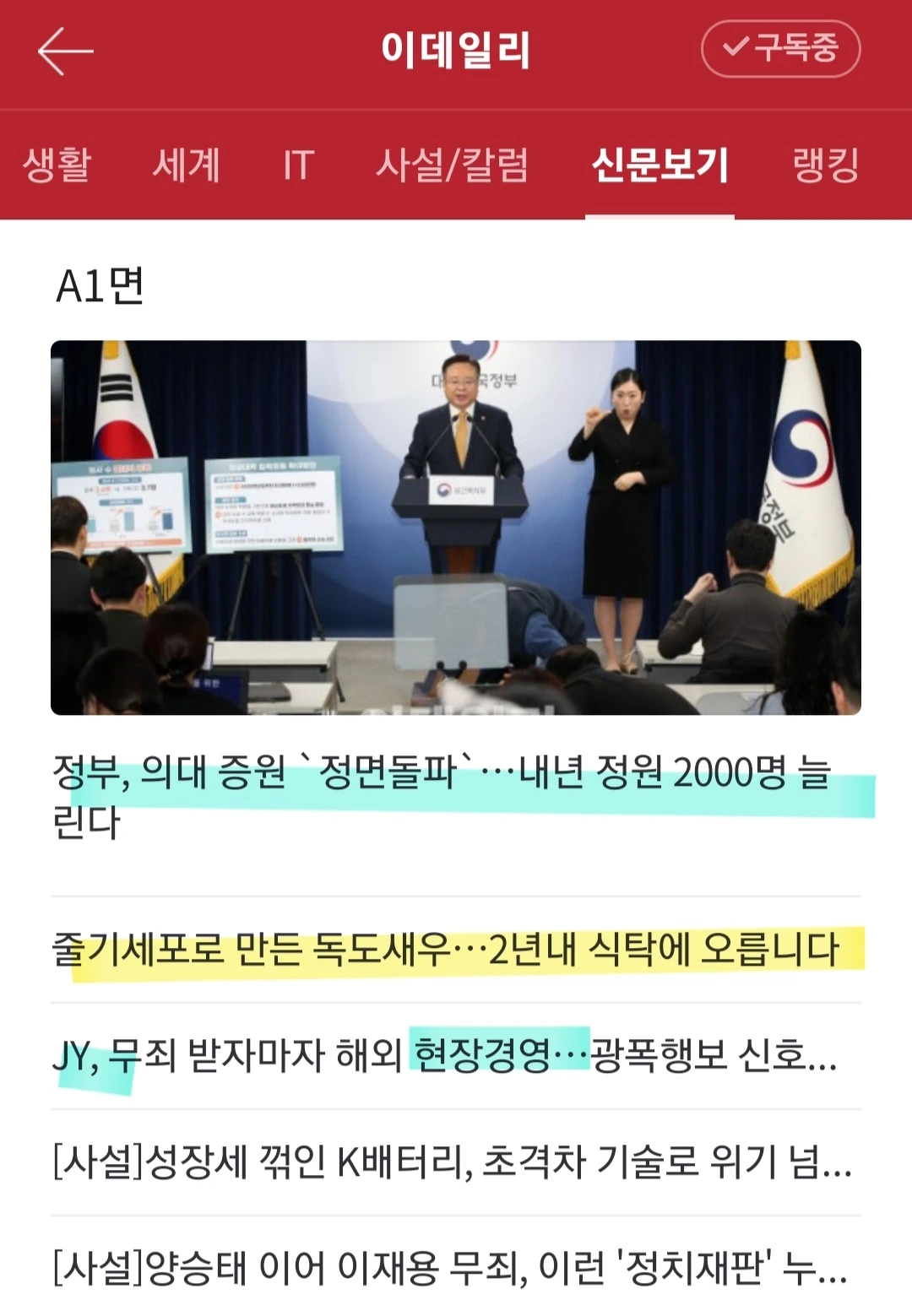 오늘 주요 기사는 1심 무죄받은 회장님 행보의 광폭 보도 + 의대 정원 2천명 증가. 2건이다.