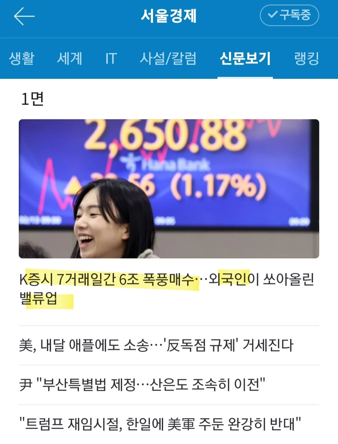 미국과 일본 증시 상승세가 무서울 정도다. 급등락엔 여전히 익숙해지지 않는다. 밸류업은 주가를 띄워야 한다는 사람들에게 필요한 좋은 명분이 아닌가 싶다. 환율은 1300원 중반대이고. 무역수지는 아직 잘 모르겠고. 부동산은 힘들어 보이는데... 증시는 상승.