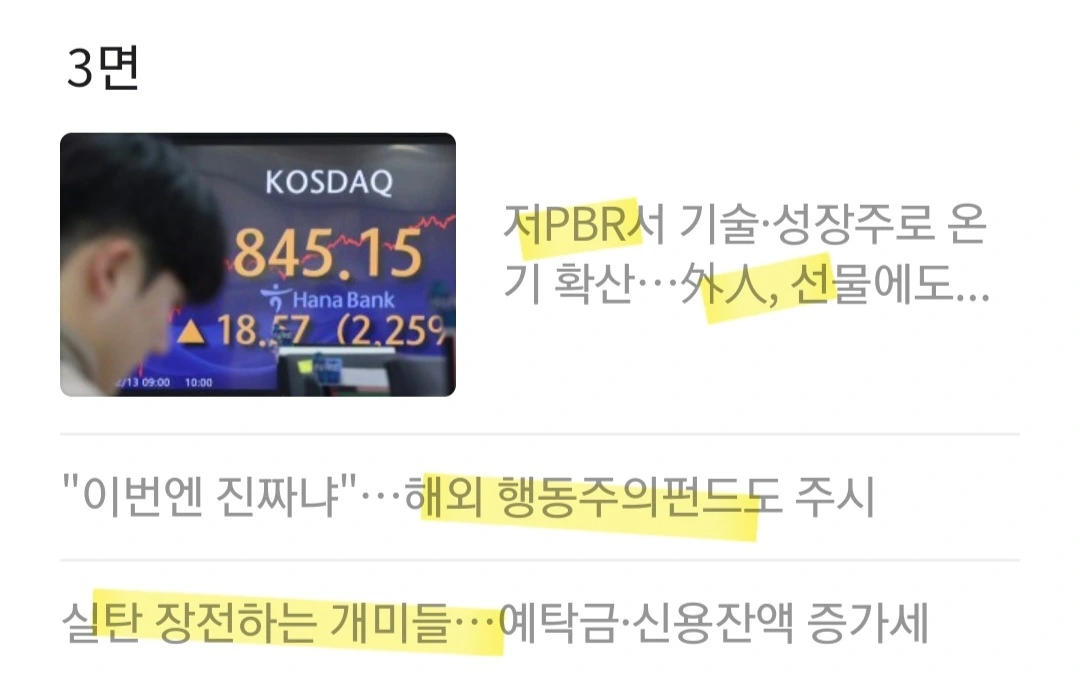 13일 코스피·코스닥지수는 나란히 3거래일 연속 상승. 이른바 자산 대비 주가가 낮은 업종이 아닌 기술주·성장주 등이 대거 강세를 기록. 정부의 밸류업 프로그램이 코스피뿐 아니라 코스닥 시장의 제값 받기도 겨냥하고 있다는 투자자의 현실적 판단이 작용. 지난달 말부터 저(低)PBR 종목으로만 쏠리던 시장 자금의 흐름이 설 연휴를 기점으로 기술·성장주로 분산되고 있다는 평가 “한국 증시가 모처럼 재평가될 것이라는 기대감 속에 저PBR주와 성장주 간에 순환매가 일어나는 장세가 당분간 이어질 것”