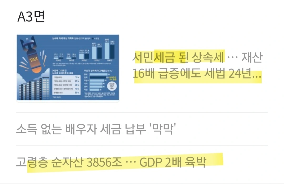 [요약] 이대로면 6년 뒤 서울 아파트 가구의 80%가 상속세 대상이 될 것. 일반 국민들도 광범위하게 과세 대상. '상속세=부유세'라는 등식이 빠르게 허물어지는 것. 경제 변화 속도에 맞춰 세율 인하와 과표 조정을 단행해 과도한 국민 세 부담을 낮춰야 한다