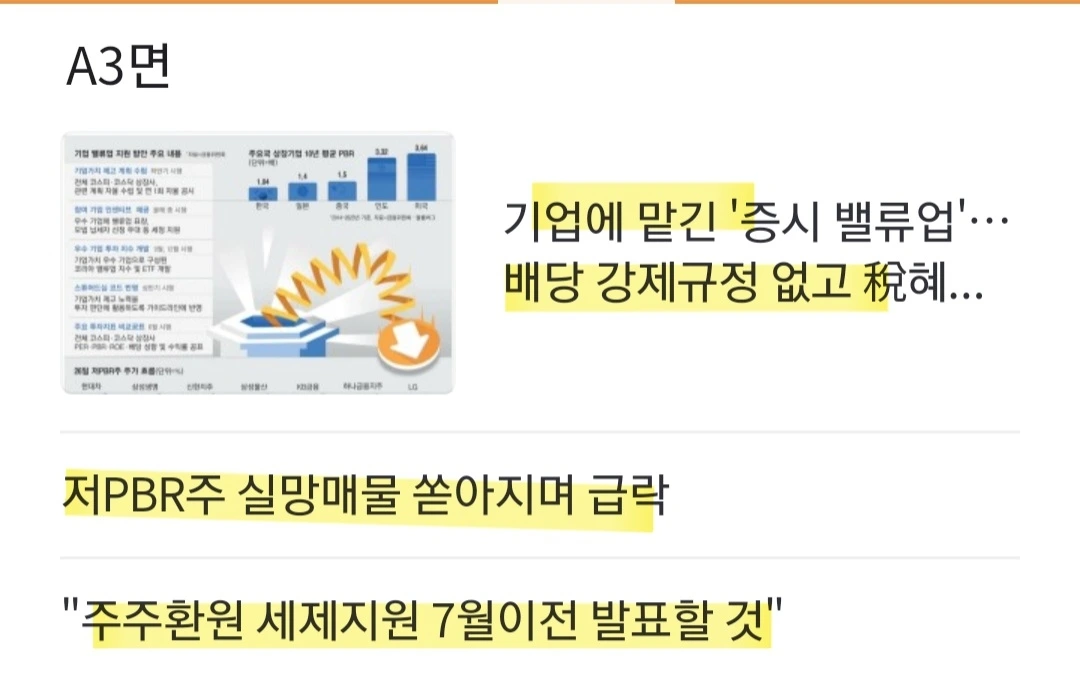 [향후] 정부는 7월 이전에 더 많은 주주 환원을 유도할 수 있는 세제 지원 방안을 내놓겠다는 입장. 기업 이사의 배상 책임 범위를 명확히 하는 상법 개정을 상반기 중에 추진키로. 내년에 도입될 예정이던 금융투자세는 올해 법 개정으로 폐지하는 방안을 추진 중. 또 주식을 매도할 때 내는 증권거래세도 현재 0.18%에서 내년 0.15%로 하향 조정을 추진. 여기에 ISA 납입 한도를 연 2000만원(총 1억원)에서 연 4000만원(총 2억원)으로 상향하고, 비과세 한도도 200만원에서 500만원으로 높이기로.