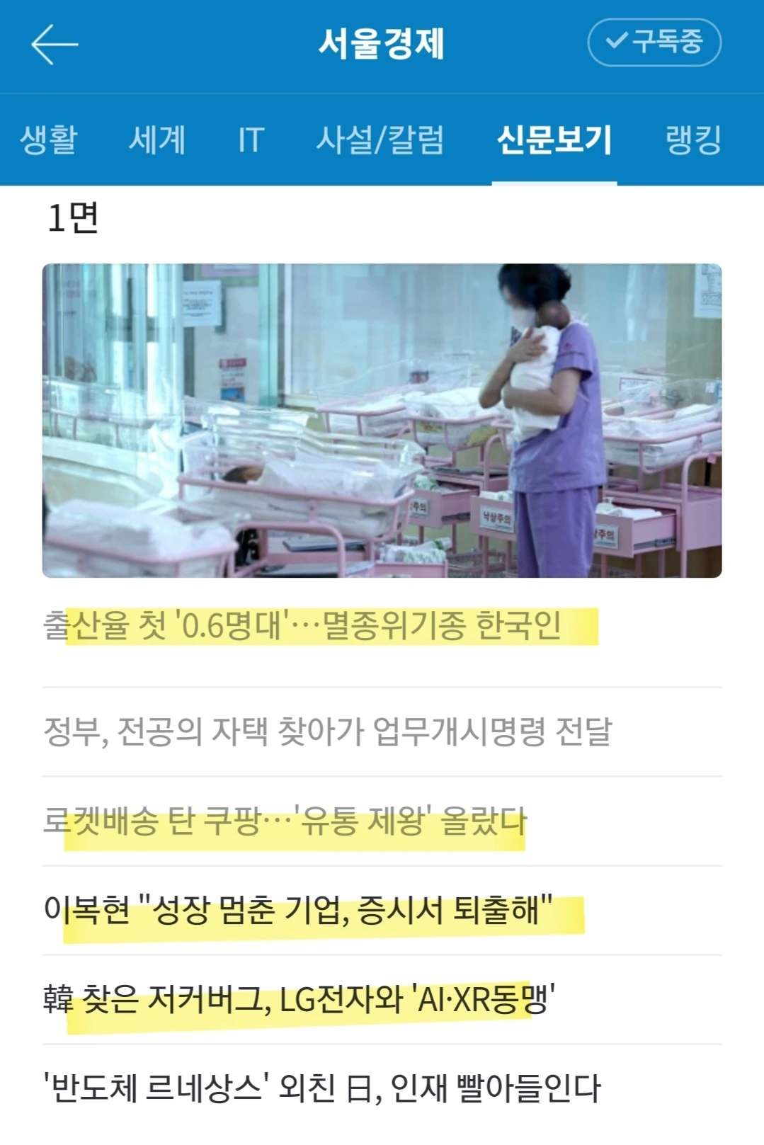 의사파업과 총선 기사를 빼도 오늘 기사 다양하다. 쿠팡의 고용인력 수는 최근 M의 보도 때문에 넣은 게 아닌가 싶다.