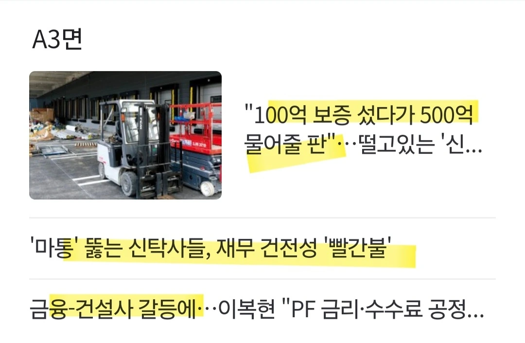 [금융감독원] 신탁사의 부실 사업장 위험이 다른 사업장으로 전이될 수 있기 때문에 신탁사의 건전성과 충당금 적립 실태를 점검할 계획. 대주주나 계열사 관련 책임준공 확약을 해주면서 자금 편익 제공 등이 있었는지도 들여다보기로. 또한 부동산신탁사와 대주 간 이뤄지는 책임준공 확약과 관련해 모범규준을 마련해 신탁사가 감당해야 하는 손실 책임 범위를 명시할 예정. // 대출 금리를 놓고 금융회사와 건설회사 간 갈등이 빚어져 PF 사업장 정상화에 차질이 생길 가능성이 커지자 긴급 대응책 마련에 나선 것. // 최근 일부 금융사가 만기 연장 때 수수료나 금리를 과도하게 적용한다는 민원을 받고 증권·보험·캐피털사 7곳에 대한 현장검사에 착수.