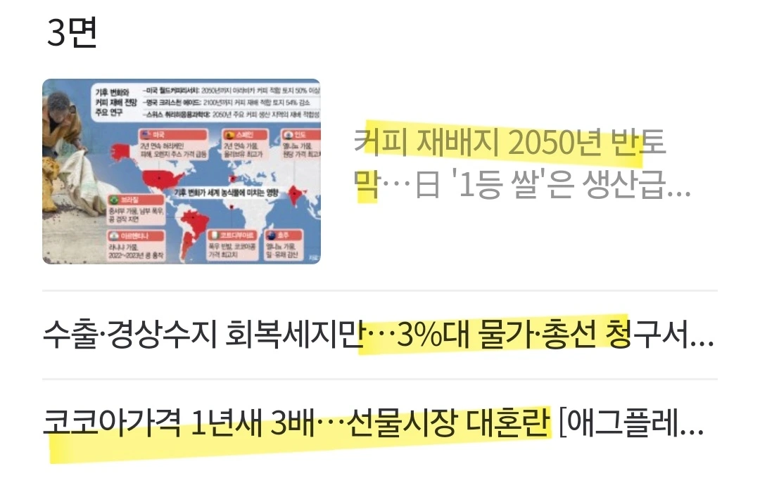 [커피] 극심한 더위와 병충해로 커피 원두 가격이 뛰고 있으며 2050년까지 세계 원두 경작지의 절반 이상이 부적합 토지로 바뀐다는 충격적인 전망. // 커피 콩은 날씨의 영향을 많이 받는 작물. 특히 절반 이상을 차지하는 아라비카종은 병충해나 기온 변화에 약한 것이 특징. 아라비카종은 밤낮의 일교차가 있는 고도가 높은 지역에서 주로 재배되는데 고온 현상과 폭우·가뭄 같은 기상 변수로 농사를 망치는 사례가 빈번. ‘재배 적합지’는 점차 줄어드는 추세