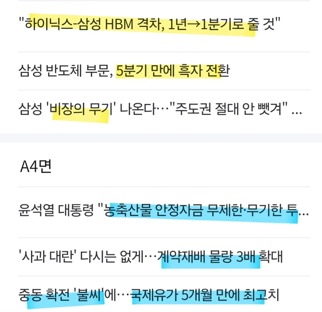 [Sk하이닉스] 월스트리트저널(WSJ) “삼성전자가 고성능 AI 칩 경쟁에서 초반엔 SK하이닉스와 마이크론에 뒤처졌지만 빠르게 따라잡고 있다”며 “삼성전자가 상반기 차세대 HBM인 ‘HBM3E’를 양산하면 한 세대 전인 HBM3 때와 같은 1년이 아니라 분기(3개월) 정도만 뒤처지게 될 것”