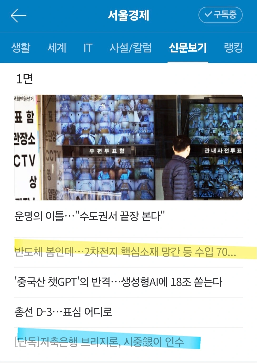 [2차전지] 올 1~2월 중간재 수입액은 전년동기 대비 15% 감소한 518억 달러. 2차전지의 핵심 원자재와 중간재 수입이 급감한 것은 중국과의 경쟁이 치열해지는 등 업황이 악화됐기 때문. 국내 2차전지 분야 1위 업체인 LG에너지솔루션의 올해 1분기 영업이익이 전년 동기보다 75.2% 감소.