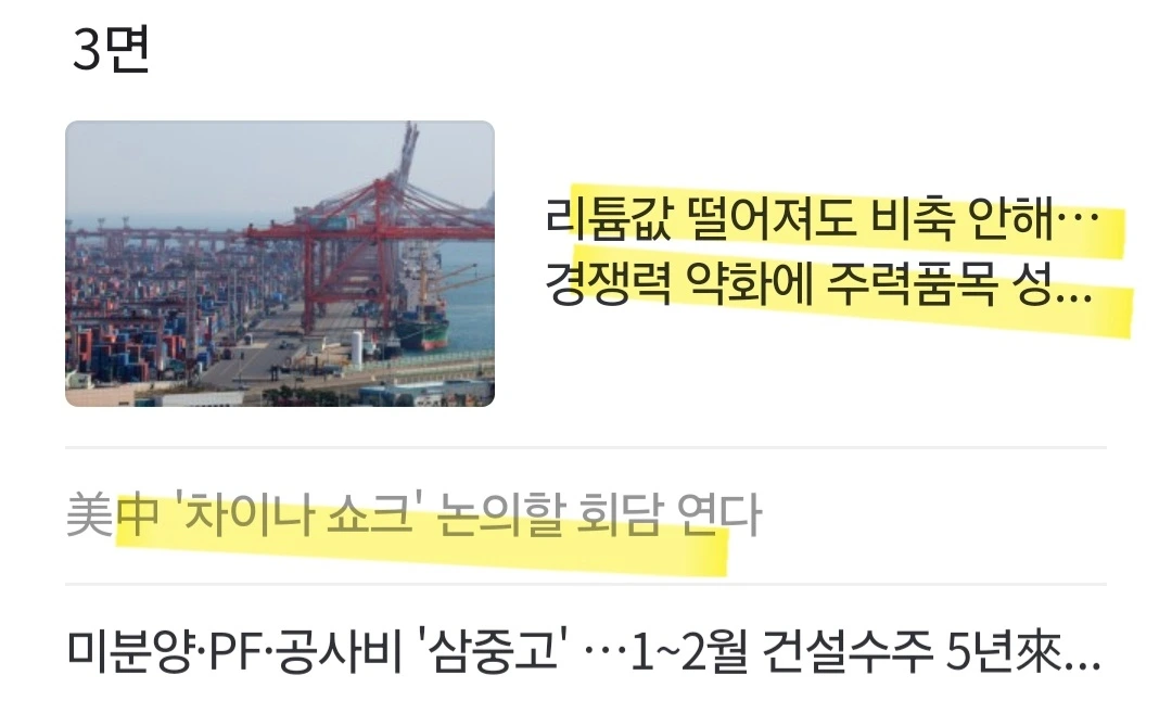 [요약] 반도체 회복세지만 2차전지·석유화학 등 다른 15대 수출 품목은 부진에서 못 벗어나는 중. 올 들어 2차전지의 핵심 원자재와 중간재 수입액이 70% 이상 급감하는 등 중국과의 경쟁이 심화하면서 산업 위축세가 뚜렷.