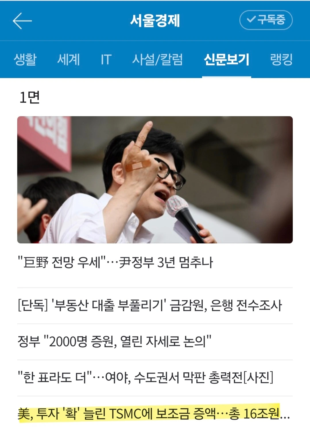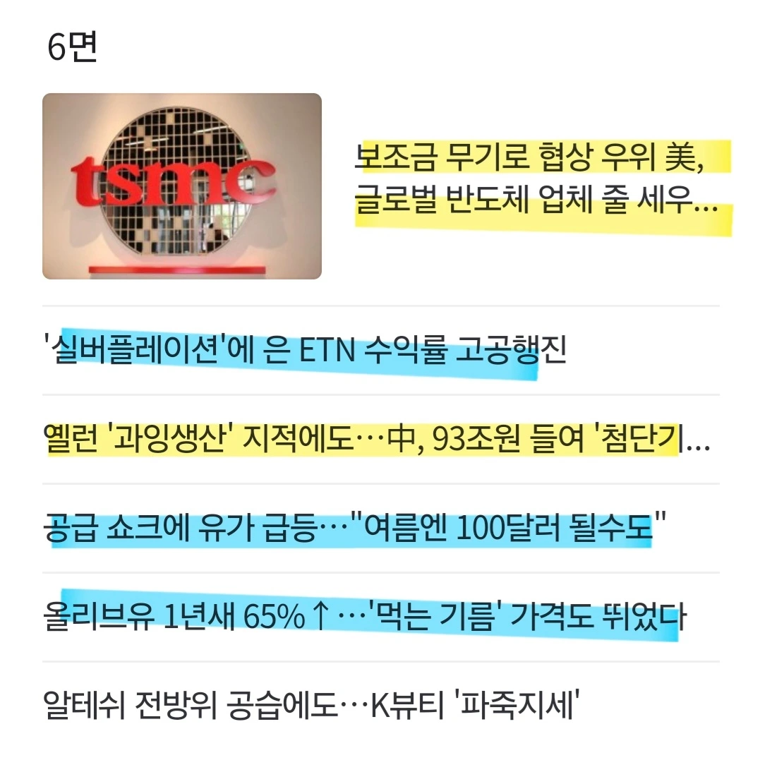[요약] 미국 정부가 세계 최대 파운드리(반도체 위탁 생산) 기업인 대만 TSMC에 보조금과 저리 대출을 포함해 총 116억 달러(약 15조 7000억 원)를 지원. TSMC는 화답하듯 미국 내 반도체 공장 투자 규모를 400억 달러에서 650억 달러 수준으로 대폭 확대하기로. 최첨단 공정인 2㎚(나노미터·10억분의 1m) 반도체도 미국에서 생산. 미 정부는 TSMC의 투자 확대와 최첨단 반도체 생산 계획을 함께 발표해 과감한 지원 뒤에 이 같은 합의가 있었음을 시사.