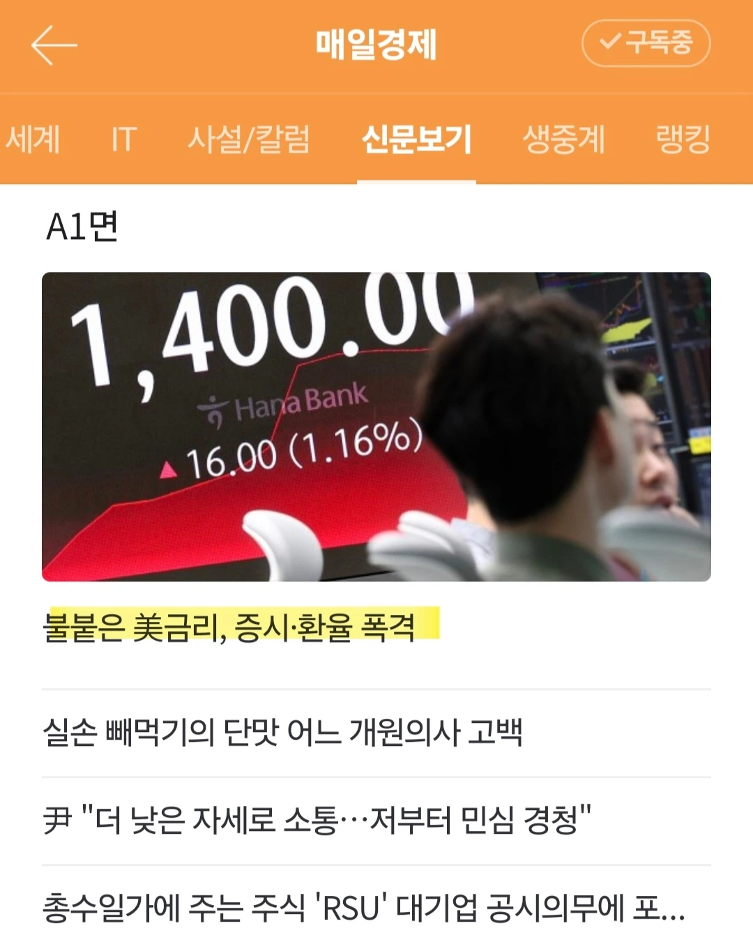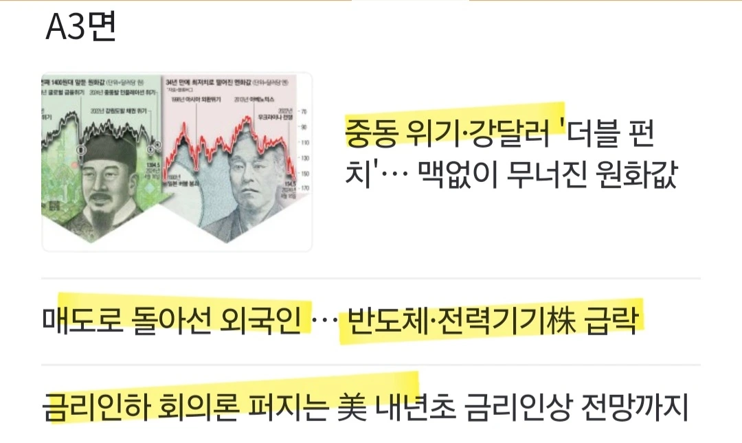 [향후 환율] 전문가들은 원화값 역시 추가 하락할 가능성. 원화가치가 과거 '위기 수준'인 1400원대에 진입한 만큼 '바닥'이 뚫린 셈. 킹달러에 따른 시장의 불안 심리와 중동 지역 확전 가능성에 따른 국제 유가 추이, 유럽 금리 인하 돌입 여부 등에 따라 원화값이 2022년 하반기 저점 수준인 달러당 1430~1440원까지 하락할 수 있다는 전망