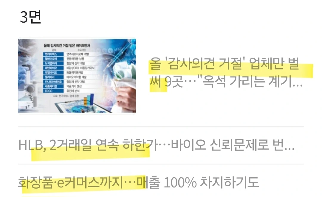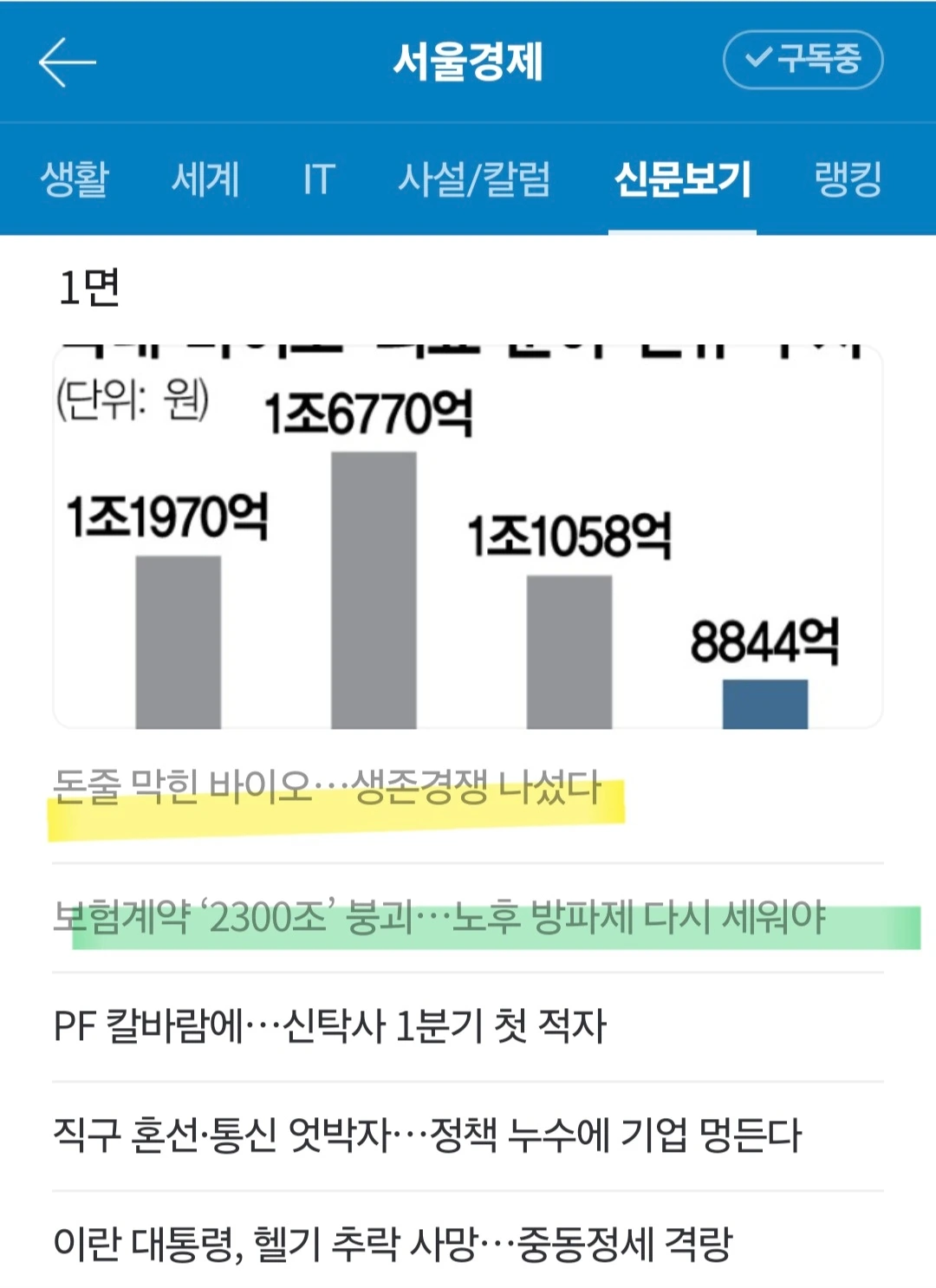 바이오... 오늘 고르긴 했지만 썩 잘 읽히지는 않는다. 보험기사도 그렇고... 뭔가 이유가 있나? 쓰기 싫은데 쓰라고 했나?