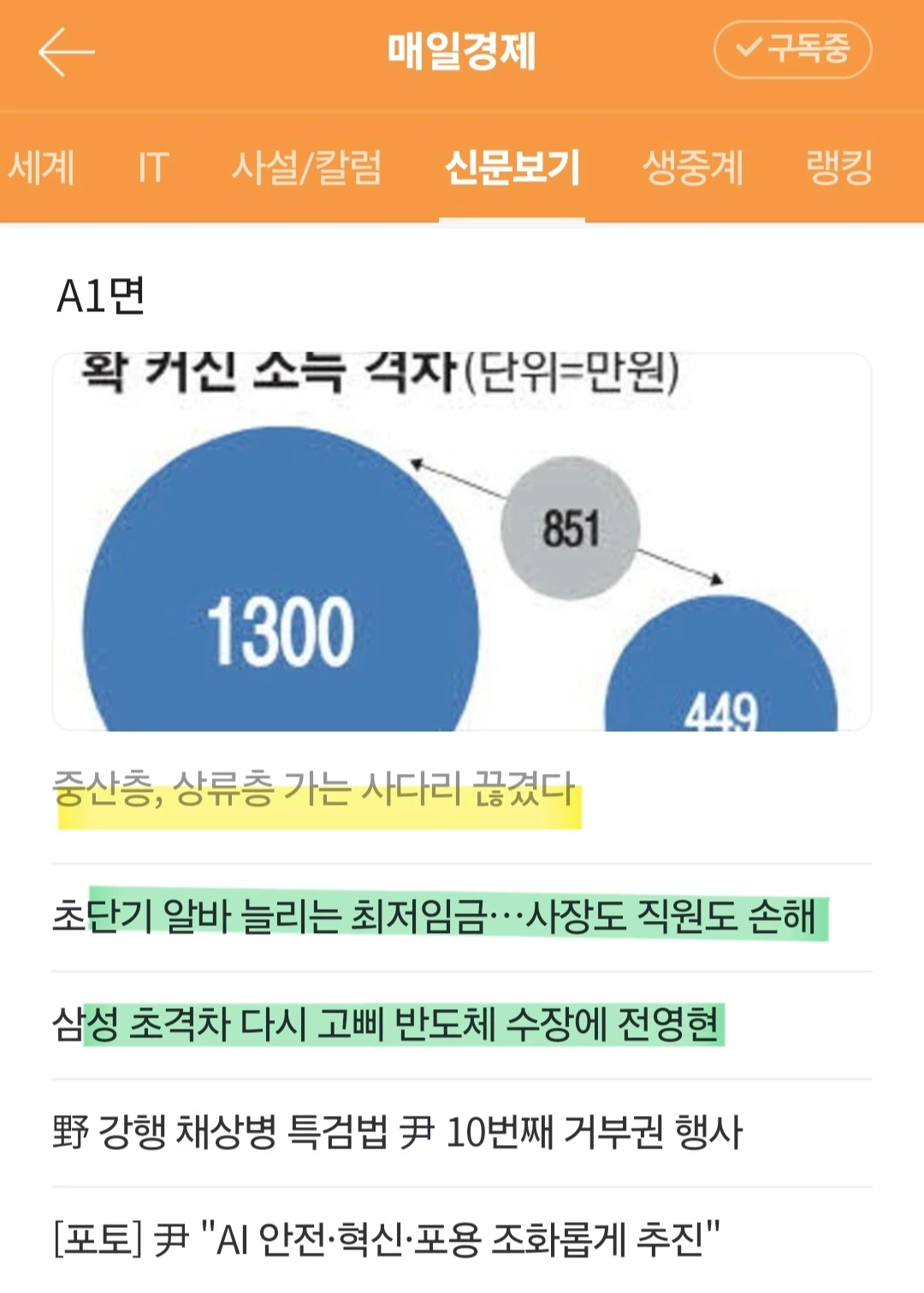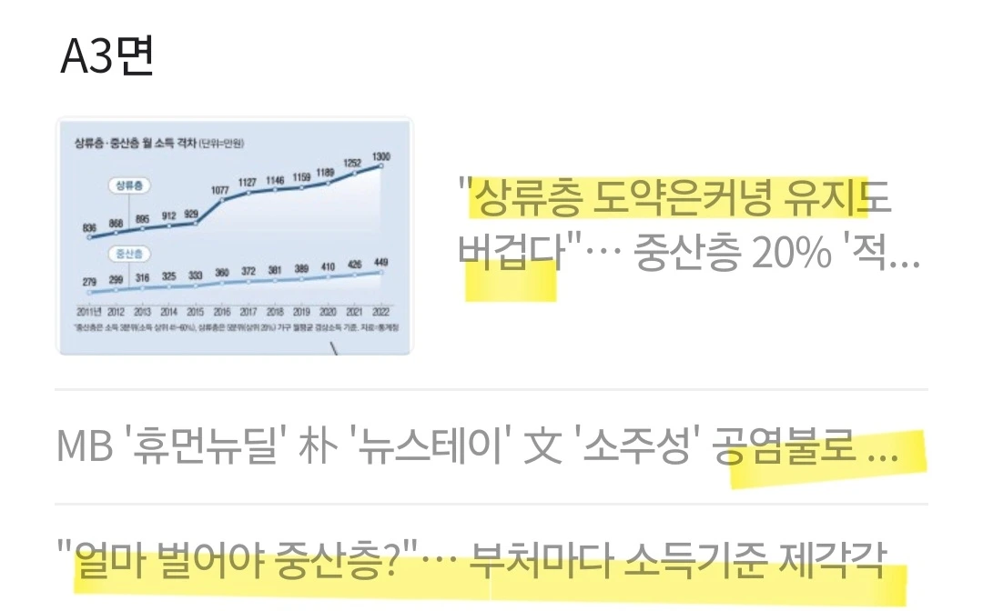 [세부내용] 중산층으로 분류되는 소득 3분위 가구 경상소득은 월평균 449만원(2022년 기준)인 반면 상류층인 소득 5분위는 1300만원. 5분위와 3분위 소득 격차(851만원)는 관련 통계를 집계한 2011년 이후 가장 높은 수준. 5분위와 4분위 소득 격차(624만원)도 최대치