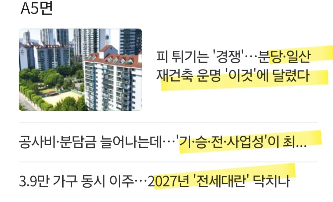 [전세시장] 선도지구 단지 입주민이 2027년 일제히 이주에 나서면 물량 부족으로 전·월세 급등 현상이 나타날 수 있다는 지적. 국토부와 LH(한국토지주택공사)는 기존 공급 물량으로 전세 수요를 감당할 수 있을 것으로 예상.