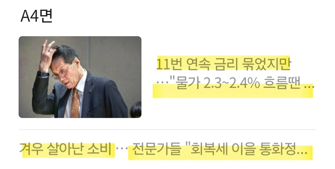 [금리인하 가능성] 향후 3개월 안에 금리가 인하될 것이라는 기대감을 차단. 현행 고금리가 이어지면 올해 소비는 0.4%포인트, 설비투자는 1.4%포인트 각각 줄어들 것으로 예측. 고금리 충격이 서민 경제에 미치는 영향은 더 직접적. 한은에 따르면 자영업자 314만명의 대출잔액은 1043조원인데, 대출금리가 1%포인트 오르면 이들의 이자 부담은 7조2000억원이 늘어나는 것으로 추산. 1인당 평균 이자 부담이 230만원이나 증가.