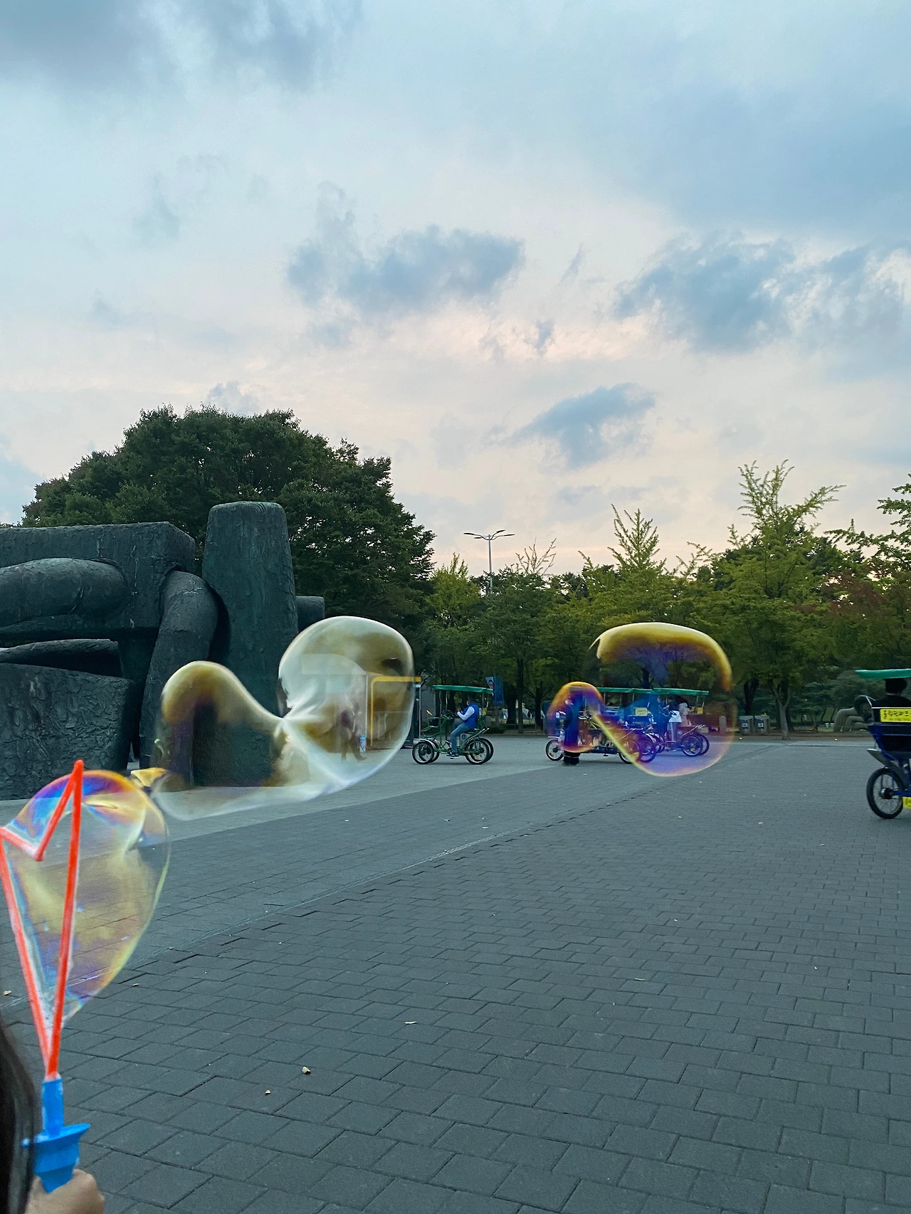 우리 둘의 발걸음에 힘과 리듬이 생기고, 즐거움이 따라붙기 시작했다. 공원 여기저기 구석구석 찾아보지만 비눗방울은 없다. 결국 우린 저 멀리 공원과 연결된 오래된 아파트 상가까지 가서 찾아내고 말았다. 거대 비눗방울을! 어려운 퀘스트를 달성한 게임 속 캐릭터들처럼, 모험심과 자신감이 100 증가하고 그에 따라 에너지도 다시 채워진다.