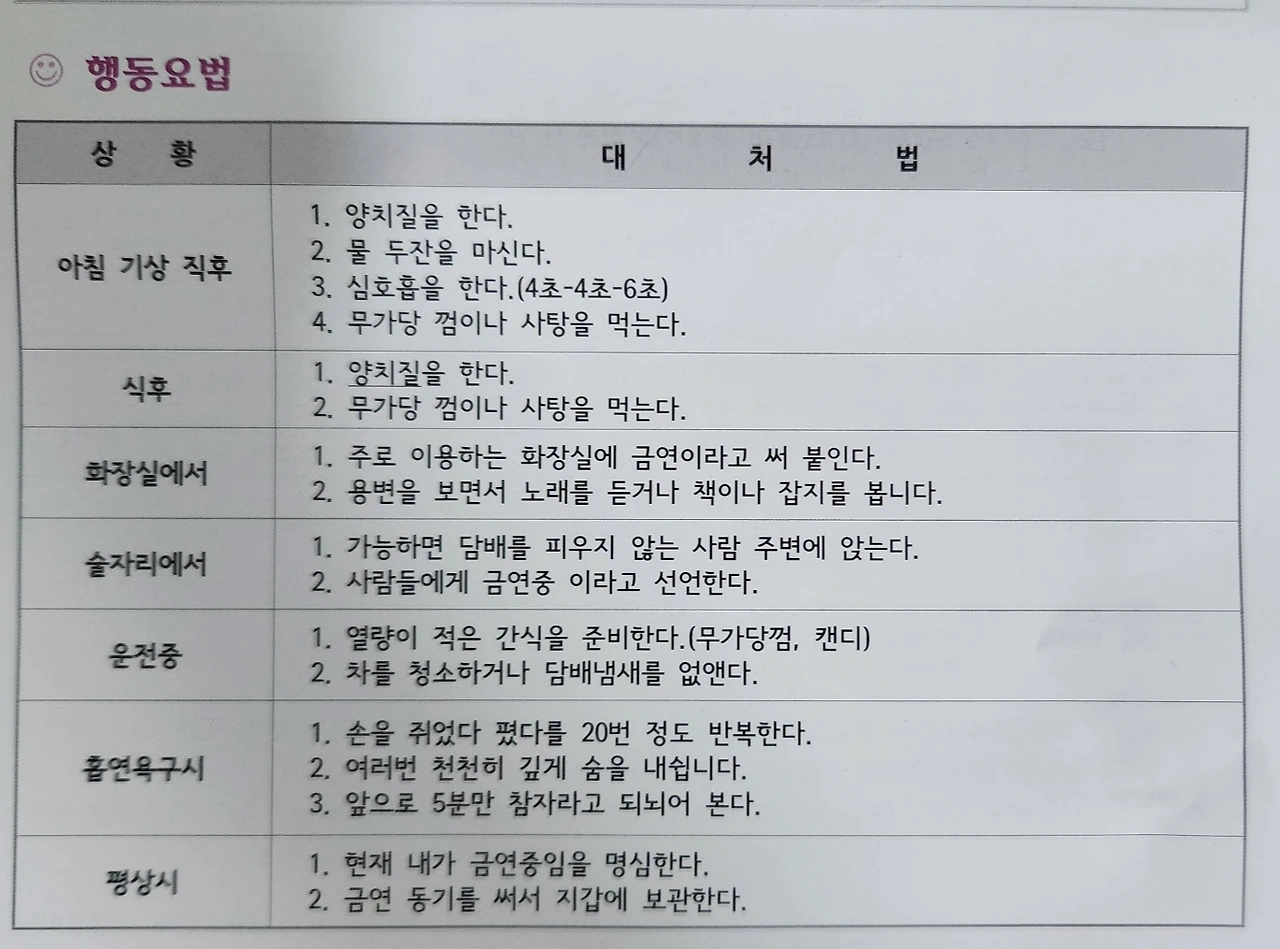 금연클리닉에선 담배를 참는 방법을 알려준다. 하루동안 어떻게 흡연을 참아야 하는지 표로 자세히 설명한다. 그 방법이 꽤나 자세해서 사뭇 놀라지 않을 수 없다. 실제로 담배를 끊으신 분이 만든 대처법이 아닐까 하는 생각이 들 정도로 자세하다.
