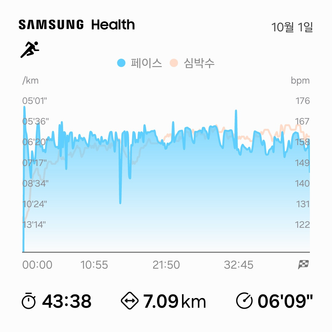 그리고 오늘 처음으로 쉬지 않고 7킬로미터를 달렸다. 숨이 차고 발바닥이 아프고 달리면서 힘에 부쳐 상체가 흔들리는 걸 느끼기는 했지만, 그래도 43분을 쉬지 않고 달려 7킬로미터를 달성했다.