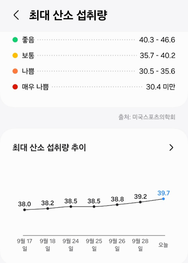 더욱 고무적인 건 최대 산소 섭취량이 금연 이후 꾸준히 증가하고 있다는 것이다. 최대 산소 섭취량은 폐활량으로, 들숨에 얼마큼 많은 산소를 마시느냐를 보여준다. 산소를 많이 흡입할수록 그만큼 더 운동을 오래 할 수 있다. 삼성헬스를 맹신하는 건 아니지만, 금연 시점부터 드라마틱하게 최대 산소 섭취량이 늘고 있는 건 신기하기는 하다.