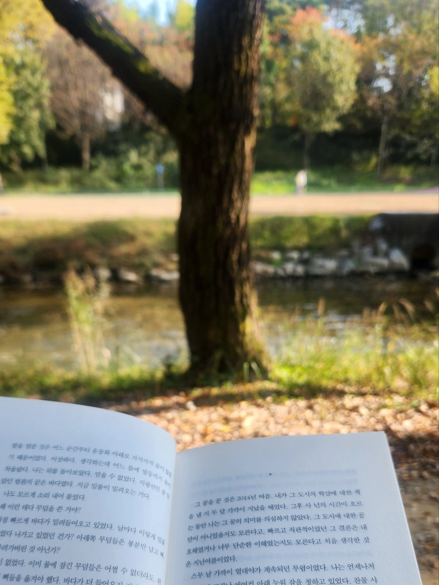 얼그레이티를 담은 텀블러와 책을 들고 다시 양재천으로 향한다. 양재천엔 앉아서 책을 읽을 공간이 많다. 햇살을 적당히 막아주는 곳에 자리하고 다시 소설에 집중한다. <작별하지 않는다> 처음부터 무겁고 어두운 분위기, 따스한 햇살이 내리쬐는 휴일 아침 분위기와는 사뭇 다르다.