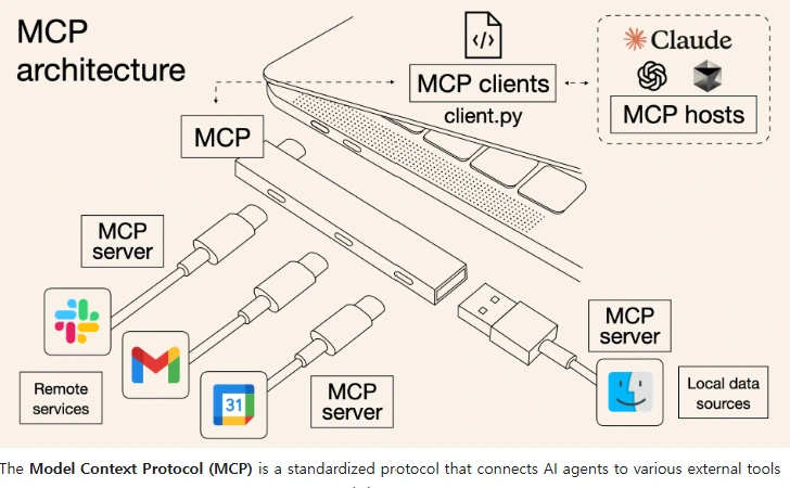 Claude를 서비스하는 AI 기술의 선두주자 중 하나인 Anthropic은 이러한 흐름에 맞춰 2024년 1월 MCP(Model Context Protocol) 프로토콜을 오픈소스로 공개했습니다. 초기에는 이 프로토콜의 영향력에 대한 관심이 크지 않았지만, 이후 MCP 프로토콜에 맞춰 여러 AI 서비스들이 등장하기 시작하며 소셜 플랫폼과 개발자들 사이에서 엄청난 주목을 받고 있습니다. 오늘은 AI 에이전트 트렌드를 짚어보고, 이 트렌드의 핵심 기술 중 하나인 MCP 프로토콜에 대해 자세히 알아보겠습니다.