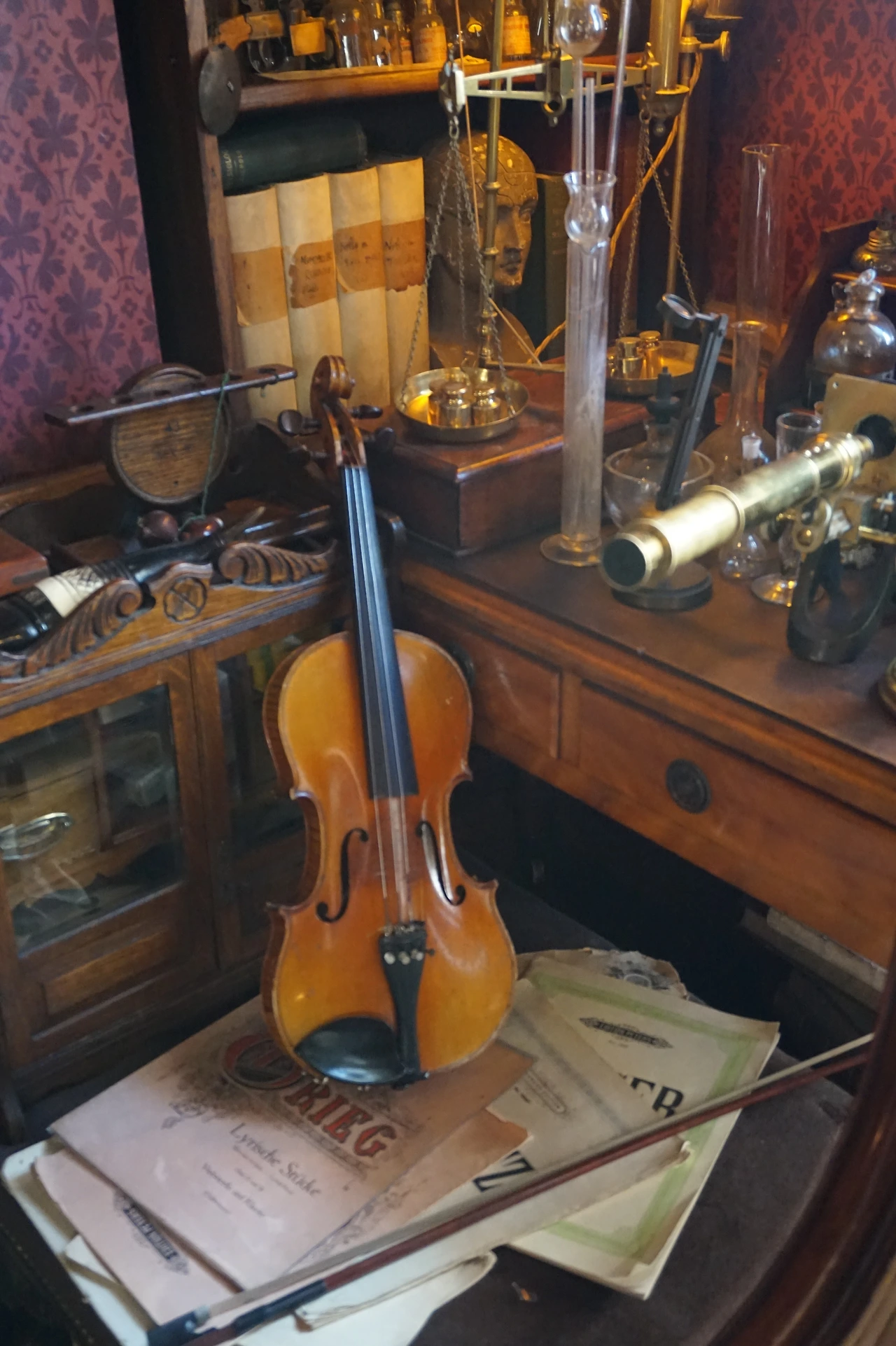 “이 모든 재능을 조화시켜서 이 친구가 무엇을 하고자 하는지, 그리고 이 모든 것을 필요로 하는 직업이 무엇인지 알아낼 수만 있다면……. 하지만 그런 시도는 당장 때려치우는 게 낫겠어.”하며 왓슨이 작성한 ‘셜록 홈스 - 그의 한계’를 쓴 종이를 재로 만든 벽난로. 왓슨이 좋아하는 멘델스존의 <노래 Lieder>를 비롯해 몇몇 훌륭한 음악적인 곡을 연주할 때도 있지만, 홈스 스스로 내키는 대로 연주할 때면 낭랑하고 구슬픈 혹은 몽롱하고 명랑한 선율을 만들어내며 왓슨을 짜증 나게 만드는 악기였던 바이올린.