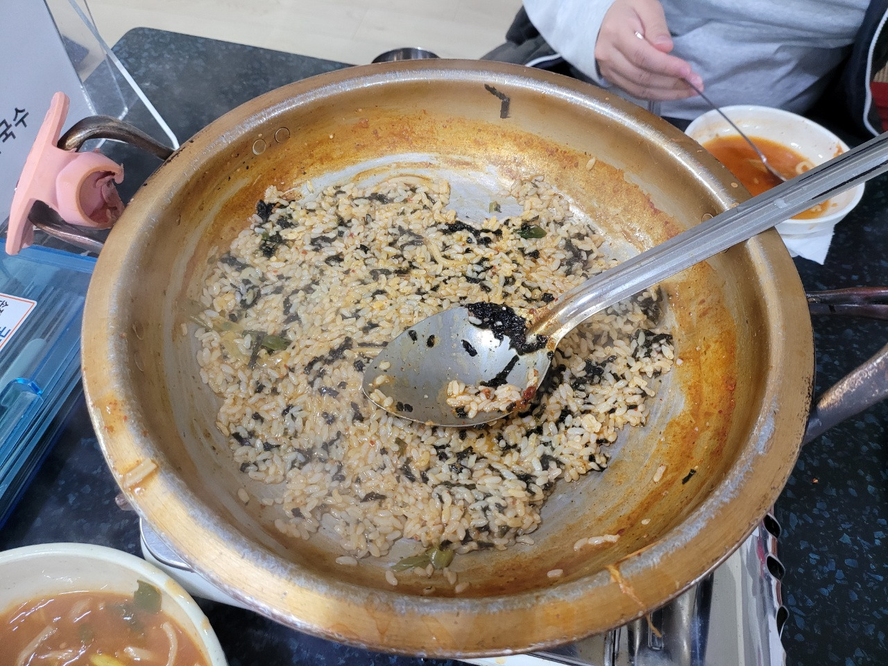 칼국수 사리를 다 건져먹을 즈음이 되면, 약간의 졸아든 국물만이 남는다. 이때, 식사의 마무리를 지어주는 것이 볶음밥이다. 볶음밥을 주문하면 약간의 국물만을 남기고 별도의 그릇에 옮겨주며, 남긴 국물에 김가루와 밥만을 넣고 밥을 볶아준다. 사실 멸치 국물, 김가루, 밥 이 세 가지만으로 구성된 볶음밥이라 큰 기대가 가지 않는 모양새다. 하지만 막상 먹어보면 국물에서 온 감칠맛과 간이 밥과 적절하게 어우러져, 기대하지 않았던 훌륭한 맛을 내어준다. 그리고 이 볶음밥에 옮겨둔 국물을 몇 술 떠서 살짝 적셔서 먹으면, 더욱 진한 맛을 느낄 수 있다. 이렇게 두부탕, 칼국수, 볶음밥을 다 먹고 나면, 대식가가 아니고서는 속이 든든하게 찰 것이다.