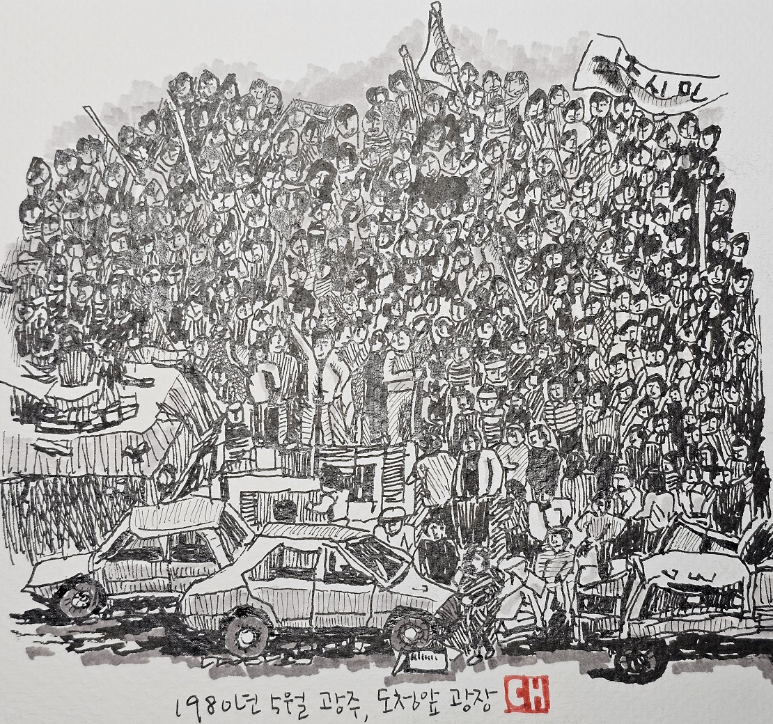 우리의 근현대사는 그렇게 부실하기 짝이 없는 사이비민주주의(대의민주주의)의 폐해를 제대로 된 민주주의(직접민주주의)가 바로잡아온 역사라고 할 수 있다. 속되게 말하면 대의민주주의가 싸질러놓은 똥을 직접민주주의가 치워온 역사였다. 이번에도 그 더럽고 냄새나는 배설물을 민초들이 나서서 치워야 한다. 우리는 각자의 자원과 노력을 동원해 가며, 나라를 잘 이끌어달라고 권력과 자원을 몰아준 자들이 저지른 패악질의 뒤처리를 언제까지 맡아야 하나. 그 과정에서 수많은 인명이 희생되기도 했다. 그림에 나타난 5.18 광주민주화운동에서처럼 말이다. 그게 왜 꼭 자랑스러운 일인가. 서글픈 일이지.