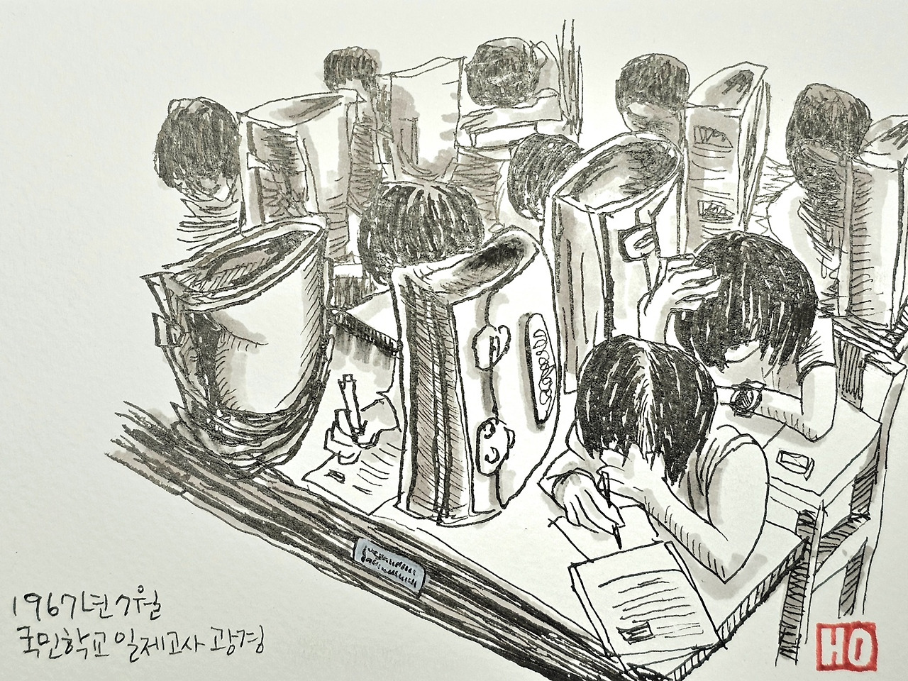 5. 그림에는 1967년 7월, 어느 초등학교(당시 초등학교)에서 ‘일제고사’를 치르는 학생들이 나타나있다. 일제고사(一齊考査)란 전국의 학교 또는 특정 지역 내의 모든 학교에서 모든 학생들이 동시에(일제히) 치르는 형태의 시험을 뜻한다. 일제고사라는 공식 명칭의 시험은 1998년에 폐지되었지만, 2008년부터 시행되는 전국 단위의 각종 진단평가와 학업성취도평가를 지금도 일제고사라고 칭한다고 한다.
