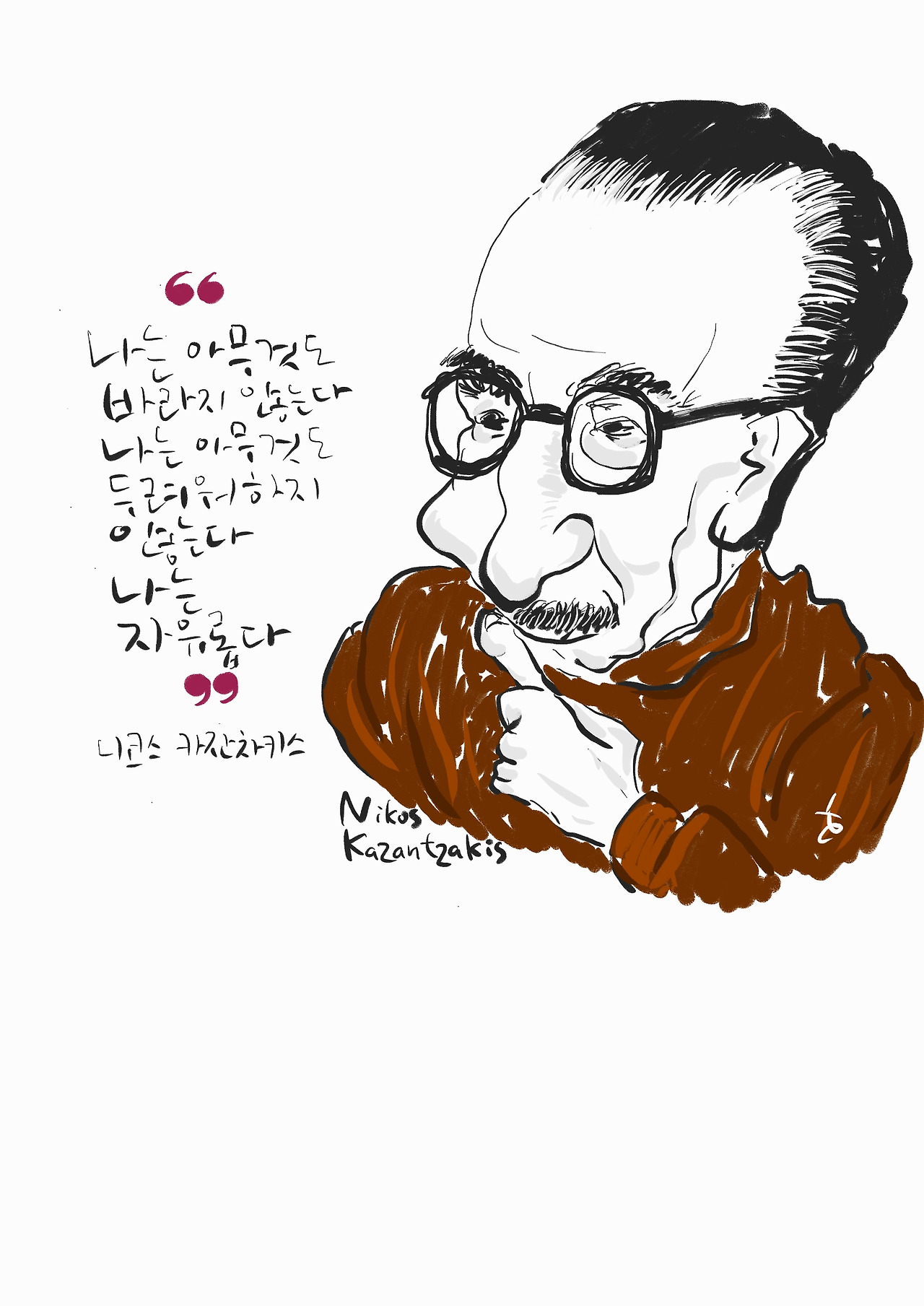 자유에 관한 정의는 셀 수 없이 많지만, 니코스 카잔차키스의 묘비에 새겨진 이 문장만큼 짧고 명료하게 본질을 꿰뚫은 정의가 또 있을까. 나는 이제 이 묘비명(墓碑銘)을 단순히 텍스트로 읽지 않고, 다시 내 마음에 새기려[銘心] 한다. 이 짧은 세 마디는 자유를 향한 인류의 오랜 사유를 관통하는 위대한 절창이기 때문이다.