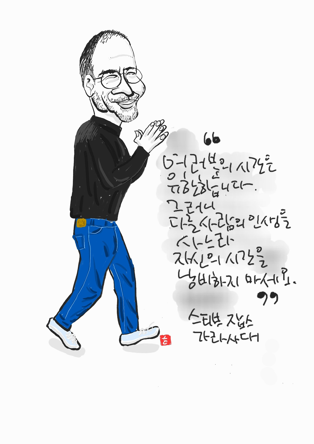 애플의 창업자 스티브 잡스는 2005년 스탠퍼드대학교 졸업식 축사에서 이렇게 말했다. “여러분의 시간은 유한합니다. 그러니 다른 사람의 인생을 사느라 자신의 시간을 낭비하지 마세요.” 이 문장은 “항상 갈망하라, 어리석을 만큼 용감하라(Stay hungry, stay foolish)”와 함께 그를 상징하는 가장 강력한 기호가 되었다.
