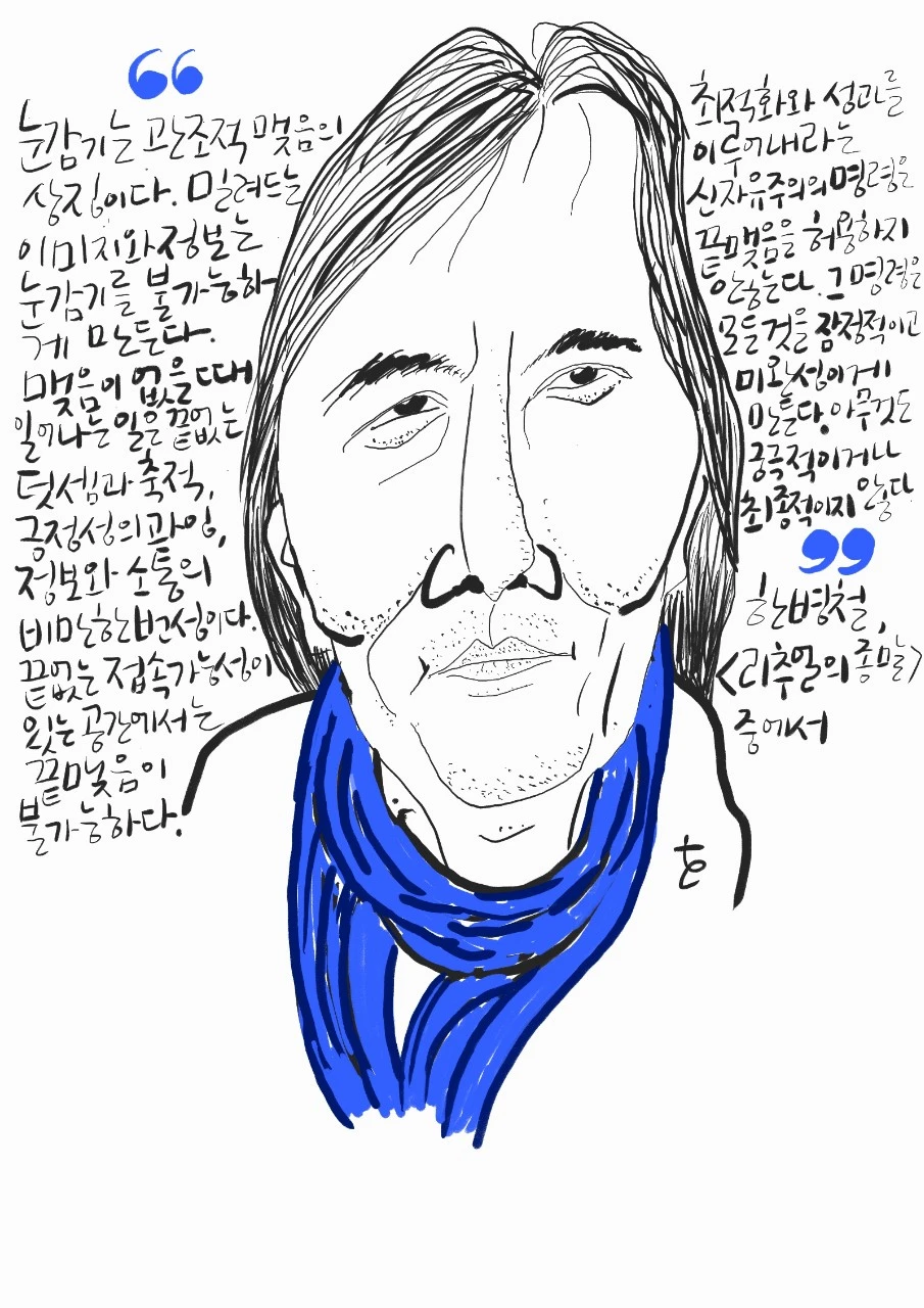 글을 마무리하려는 순간 문득 또 한 가지 의문이 생겼다. 나는 이 글을 ‘생산’했고 ‘좋아요’와 ‘공유’와 ‘댓글’을 통해 널리 그리고 깊이 ‘소통’하기를 원한다. 이를 바탕으로 내 글쓰기의 이력에서 좋은 ‘성과’를 내기를 원한다. 또 한편으로는 내 글쓰기 행위가 나름의 신성함을 지켜주는 리추얼이자 내 삶 자체와 관련을 맺는 '강한 놀이'이기를 기대한다. 그렇다면 과연 내 글쓰기 행위는 신자유주의에 의한 생산/소통/성과의 강제가 작동한 결과일까 아닐까? **