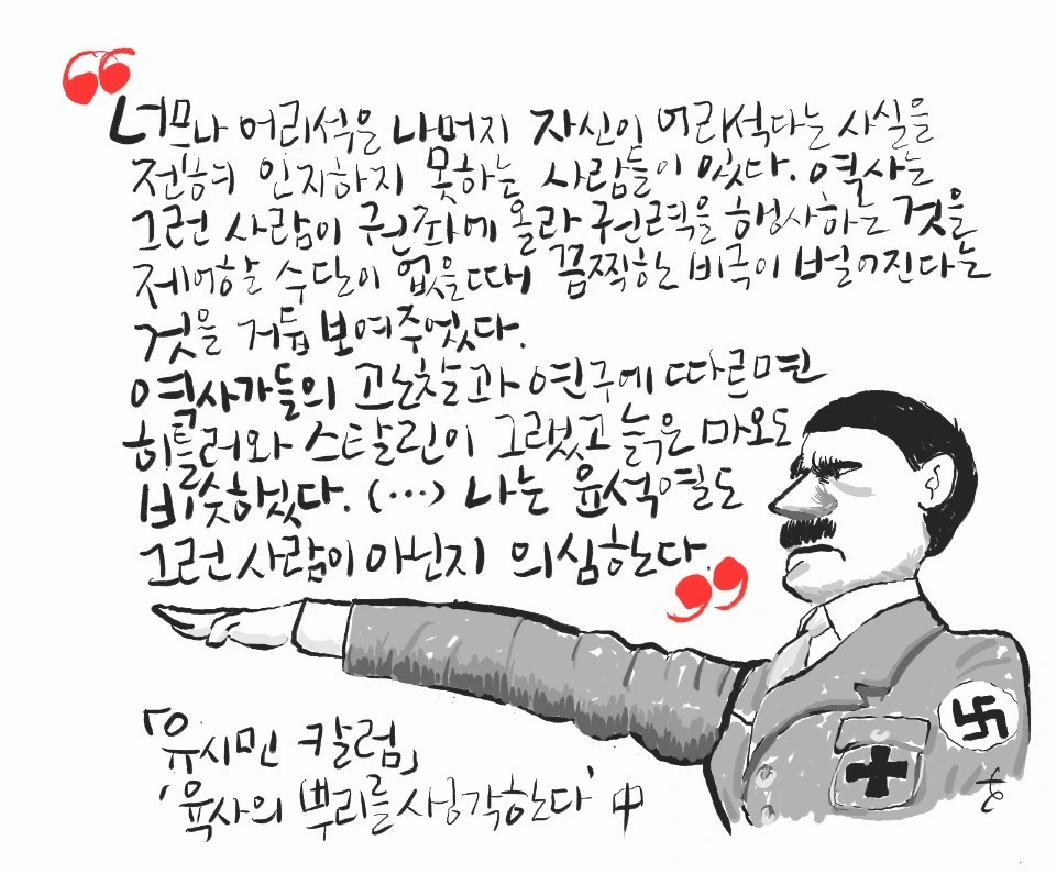 2. 물론 그 능력은 글에서도 드러난다. 그가 한 달에 한 번쯤 '민들레'에 쓰는 칼럼에서도 확인할 수 있다. 이번에 쓴 "육사의 뿌리를 생각한다"에서는 육사의 뿌리를 독립군과 광복군에서 찾아야 함을 논증하는 데 많은 지면을 할애했다. 하지만 이 칼럼의 핵심은, 윤통은 히틀러나 스탈린이나 늙은 마오쩌뚱처럼 메타인지(meta-cognition) 능력이 심히 부족한 자이므로, 자신이 얼마나 어리석은지도 모를 정도로 어리석은 탓에 홍범도동상 이전건 등 작금의 이슈들이 벌어진 것이고, 앞으로도 얼마나 더 심각한 일이 벌어질지 두렵다는 것이다. "자신의 무능을 전혀 인지하지 못할 정도로 무능한 대통령이 권력을 마음껏 휘두르게 방치하면 대한민국과 한반도에 어떤 일이 생길까?"라고 묻고 있다. 이번에도 '메타인지 능력이 부족한 사람'을 범주화한 다음, 윤통을 그 범주 속에 위치시켜서 해석하는 능력이 돋보인다.