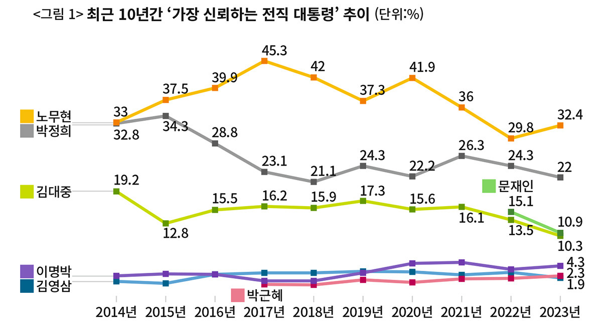 하지만 DJ는 재임 중 IMF 극복, IT강국과 복지국가의 기반 마련, 남북 평화체제 정착, 문화강국의 토대 구축, 용서와 화해의 정치문화 조성 등 많은 가시적인 업적을 남겼다. 최초의 평화적 정권교체와 민주진보세력의 정권 재창출도 한 진영의 성과를 넘어서는 역사적 기여다. 이들 업적은 그의 정치이력 중 거의 전 기간 동안 벌어진 끊임없는 살해위협, 투옥, 가택연금 그리고 빨갱이라는 부당한 이념 공격을 이겨내고 거둔 성과이기에 더욱 값지다. 이에 대해 전 세계인은 노벨평화상을 줌으로써 그에게 뜨거운 존경을 표했다. 하지만 우리 국민은 그에게 존경은커녕 신뢰를 보내는 것조차 대단히 인색하다. 그 이유를 정확히 알 수는 없으나, 노통의 예상치 못한 자살로 인한 지못미의 감정이 DJ에 대한 신뢰까지 노통에게로 쏠려가게 한 것이 아닌가 짐작해볼 수는 있다. 어쨌든 심히 안타까운 일이다.