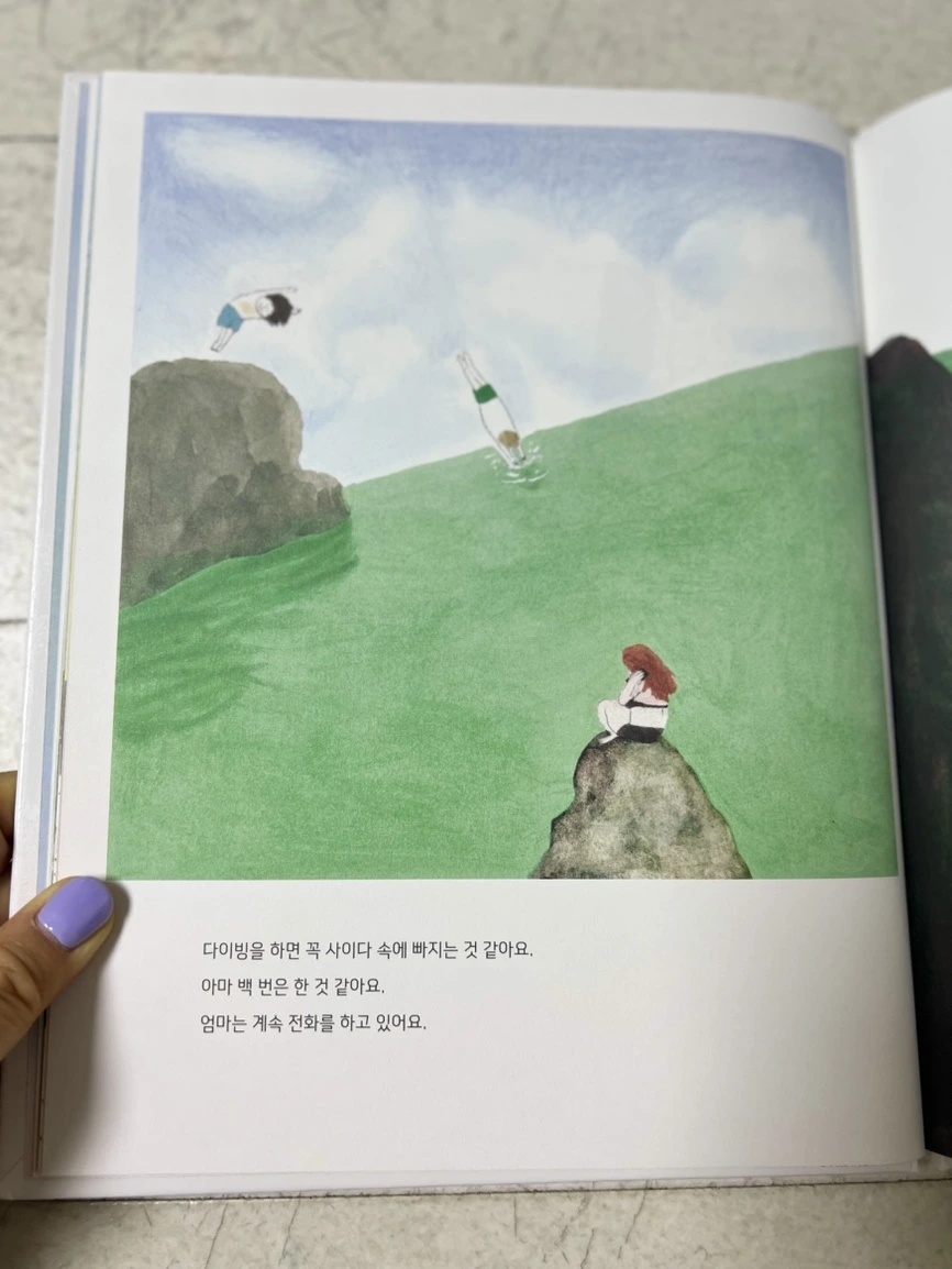 이 그림책의 매력을 말하자만 일단 표지가 예쁘다. 파란색 큰 폰트로 ‘여름이 오기 전에’ 제목이 시선을 사로잡고 아래 반짝이는 윤슬 위에 떠 있는 엄마와 아이 모습이 즐겁고도 편안해 보인다. 보고만 있어도 기분 좋은 여름 그림책다운 청량하고 시원한 표지다. 본문에서도 파란 하늘과 초록 바다, 아스라이 물든 노을빛까지 다양한 색감의 그림과 귀여운 일러스트를 찾아보는 재미가 쏠쏠하다. 대학에서 서양화를 전공하고 여러 분야 그림책에 그림을 그려온 작가의 내공이 엿보인다.