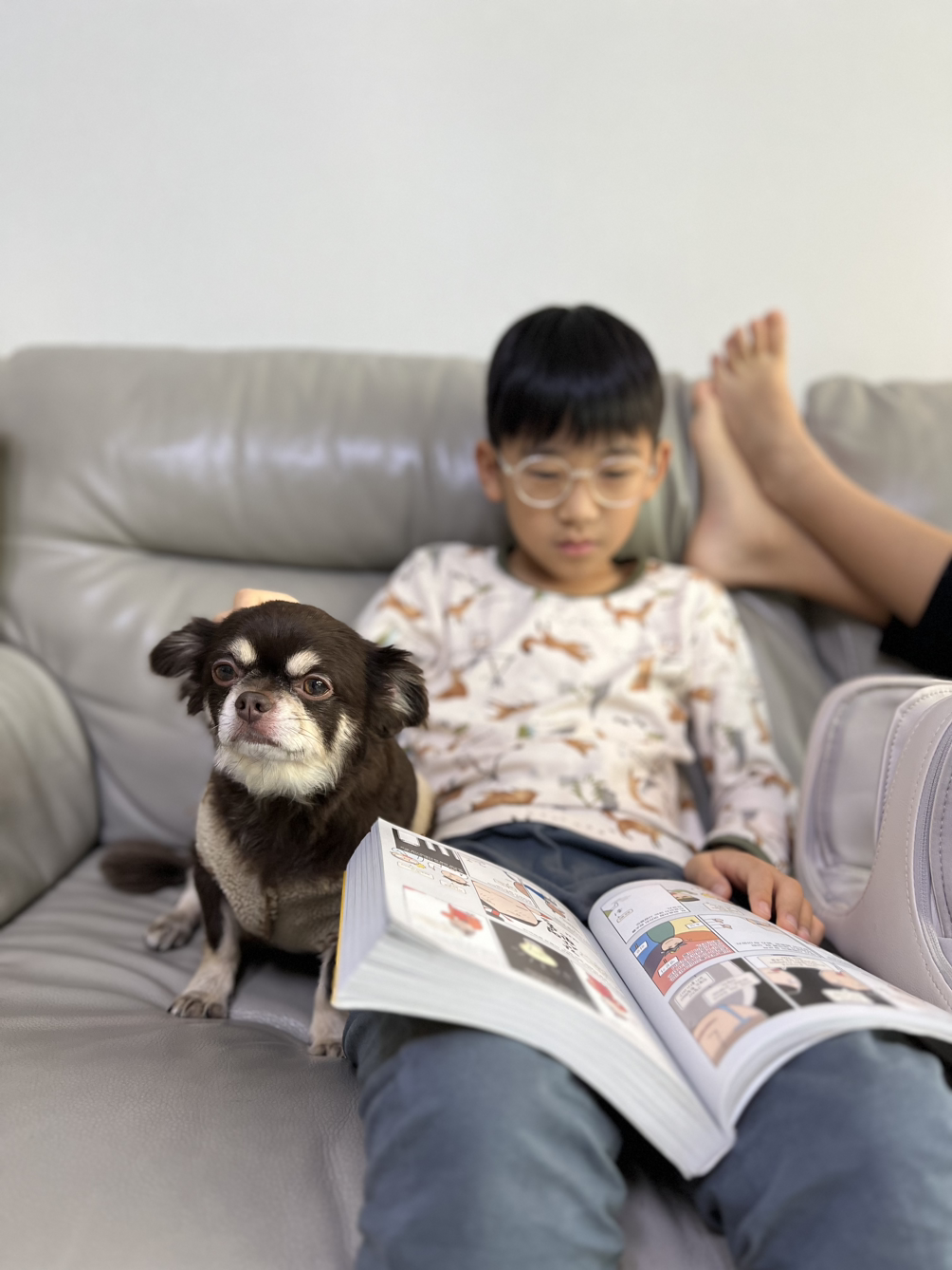 마루와 함께 살면서 가장 큰 변화는 아이들에게 화가 덜 난다(!)는 점이다. 일단 초보 반려인으로서 낯설고 새로운 존재 마루에게 온 신경을 쏟다 보니 아이들의 사소한 짜증과 불평은 크게 신경이 안 쓰였다. 내가 덜 예민하게 바뀌니 아이들 좀 더 편안해진 듯했다. 좀 속상한 일이 있더라도 털북숭이 마루를 쓰다듬고 있으면 마음이 차분해지고 안정감이 들었다. 과거와 미래에 대한 걱정이 사라지고 오직 현재에 머물게 하는 마법! 큰 아이도 마찬가지. 소파에서 아이가 책을 읽으면 마루가 가만히 몸을 밀착하며 엎드리고, 아이가 쓰다듬는 모습을 자주 볼 수 있었다. 최근 반려동물을 키우면 스트레스와 우울감이 감소하는 등 실제로 건강에 이롭다는 연구결과를 자주 접하는데, 우리 집 임상결과를 봐도 마루가 확실히 정서적 안정감을 주는데 큰 기여를 하는 것 같다.