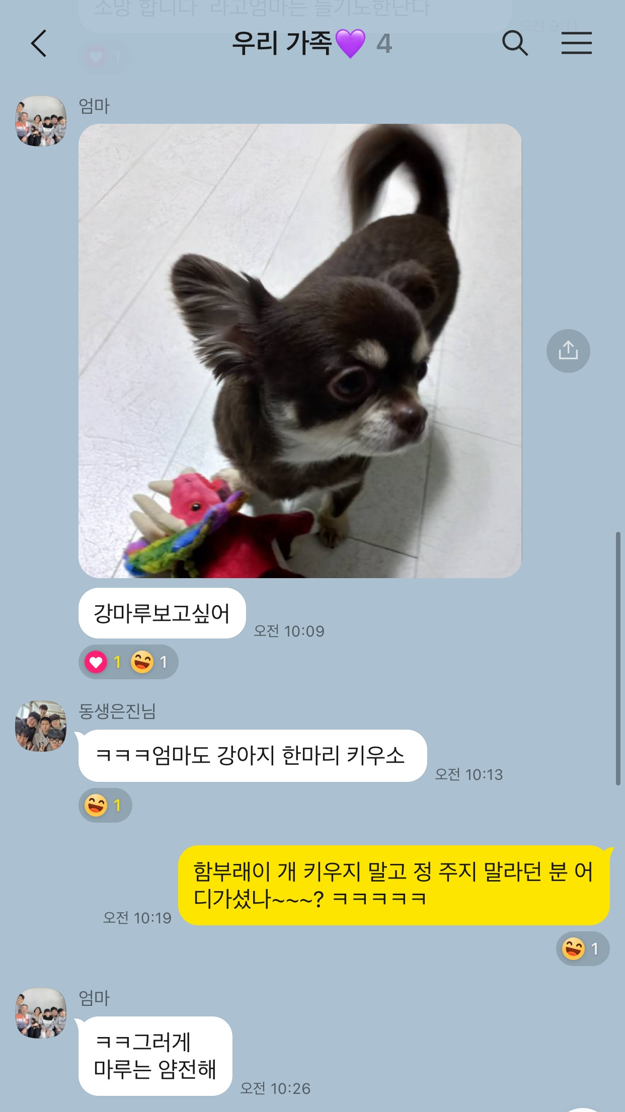 나는 “함부래이 강아지 키우지도 말고, 정 주지 말라던 분 어디 가셨나~~? ㅋㅋㅋㅋㅋ” 하고 받아쳤다. "ㅋㅋ 그러게, 마루는 얌전해." 하시는 엄마. 하핫, 울 부모님도 우리 마루의 진중하고도 귀여운 반전 매력에 빠지신 게 틀림없다. 강아지 키우지 말라는 엄마 말 안 듣기 잘했지. 이번 역귀성 성공적. 엄마, 아빠 다음 추석엔 개손자 보러 또 오세요!