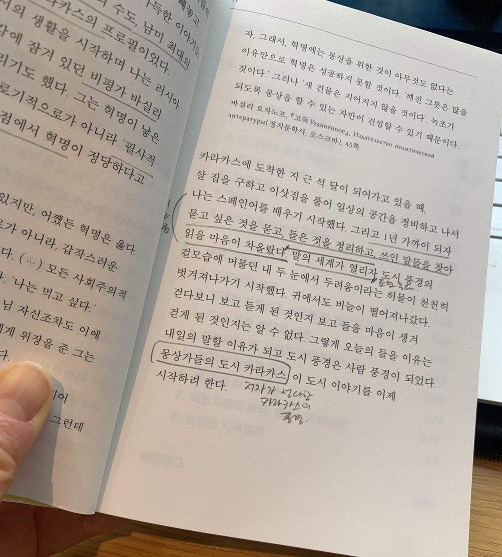 잿빛 하늘이 무겁게 내려앉은 날, 서정 작가님의 <카라카스 수업의 장면들: 베네수엘라가 여기에> 책을 챙겨서 밖으로 나왔다. 이름도 낯선 '카라카스'는 남미 베네수엘라의 수도 이름이다. 이 나라에 대해 내가 아는 건 문장이 아니라 오직 단어로 존재한다. 남미, 스페인어, 차베스, 위험, 강도, 불황 등등. 여행지로서 각광받는 곳도 아니고, 아는 것도 없는 나라에 대한 책을 펼치게 된 건 저자 '서정 작가님'에 대한 관심 때문이었다.