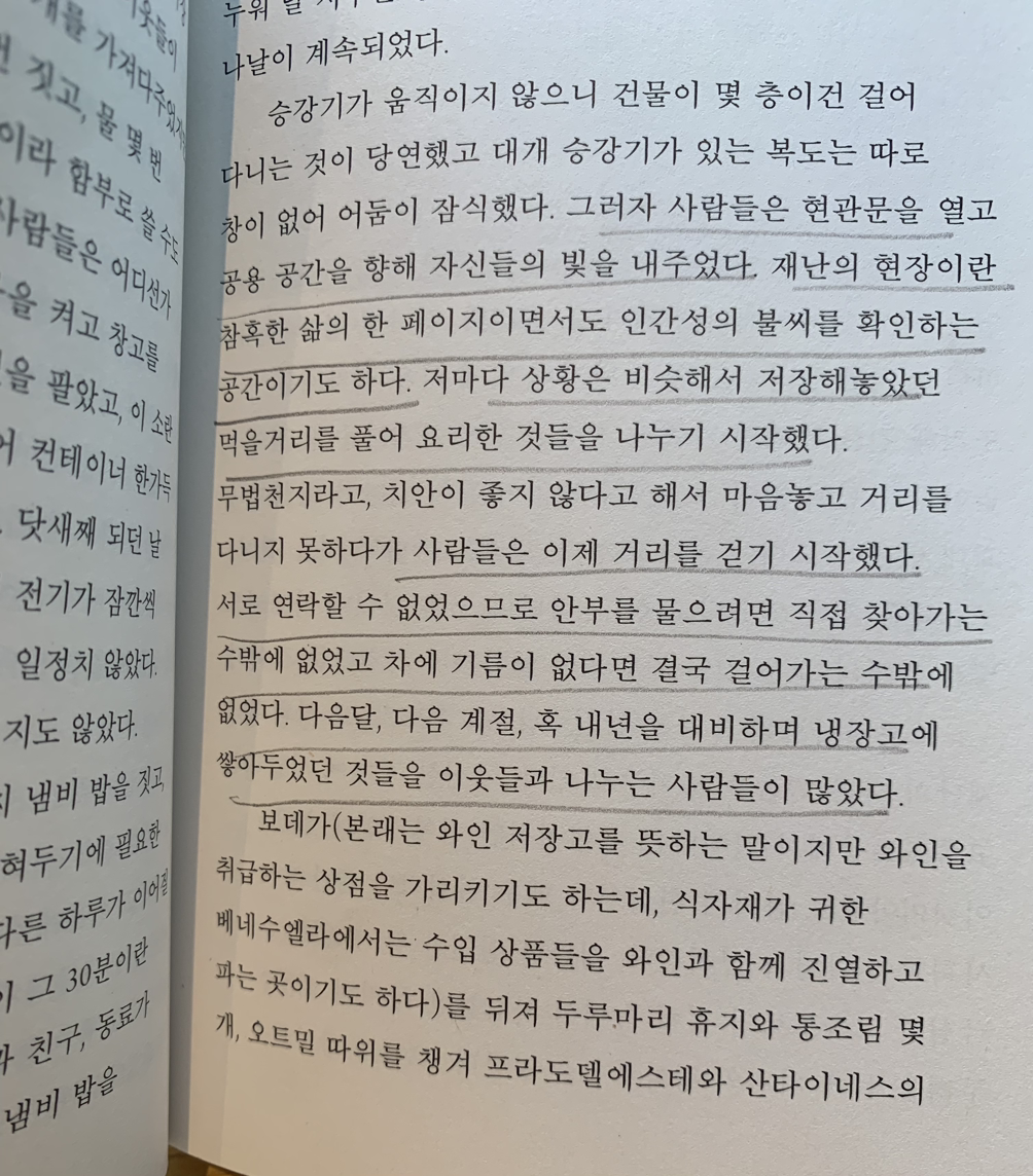 특히 대정전의 상황에서 인간성 상실의 모습이 펼쳐지는 것이 아니라, 이웃들과 아보카도 한쪽이라도 나눠먹는 장면은 뭉클하기까지 했다. 작가는 "재난의 현장이란 참혹한 삶의 한 페이지면서도 인간성의 불씨를 확인하는 공간이기도 하다(97쪽)"고 표현했다. 그에게 대정전은 일시적인 불편함을 넘어 문명에 대한 성찰과 일상의 습관을 바꾸는 경험으로 확장된다. 전동 핸드밀이나 커피머신 대신 수동 핸드밀에 드립커피를 즐기고, 전기밥솥 대신 압력밥솥이면 충분한 삶. 이어 "삶을 비극이라 상정하는 순간, 우리는 비로소 삶을 시작한다"는 W.B.예이츠의 문장으로 마무리하는 솜씨에 경탄했다. 이 책을 읽는 내내 베네수엘라에 대한 정보, 지식뿐 아니라 저자의 풍부한 독서내공을 엿보는 즐거움이 컸다.