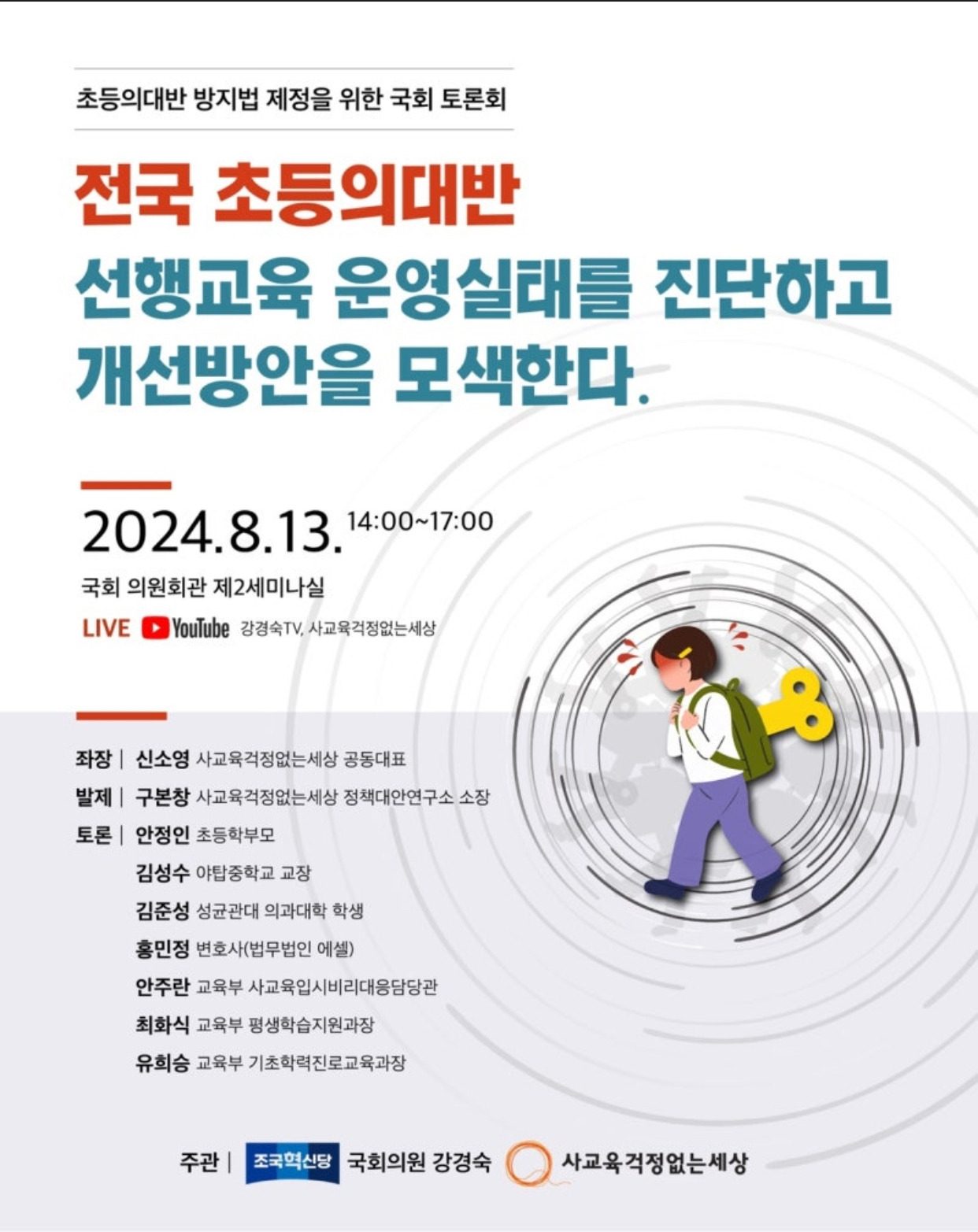 사교육걱정없는세상 X 강경숙 의원실(조국혁신당)에서 주최하는 '초등 의대반 방지법 제정을 위한 국회 토론회' 토론자로 말이에요. 사교육걱정없는세상 회원이 된지 오래 되었지만 본격적으로 활동하기 시작한 건 작년 초 노워리 기자단 활동을 시작하면서부터였죠.