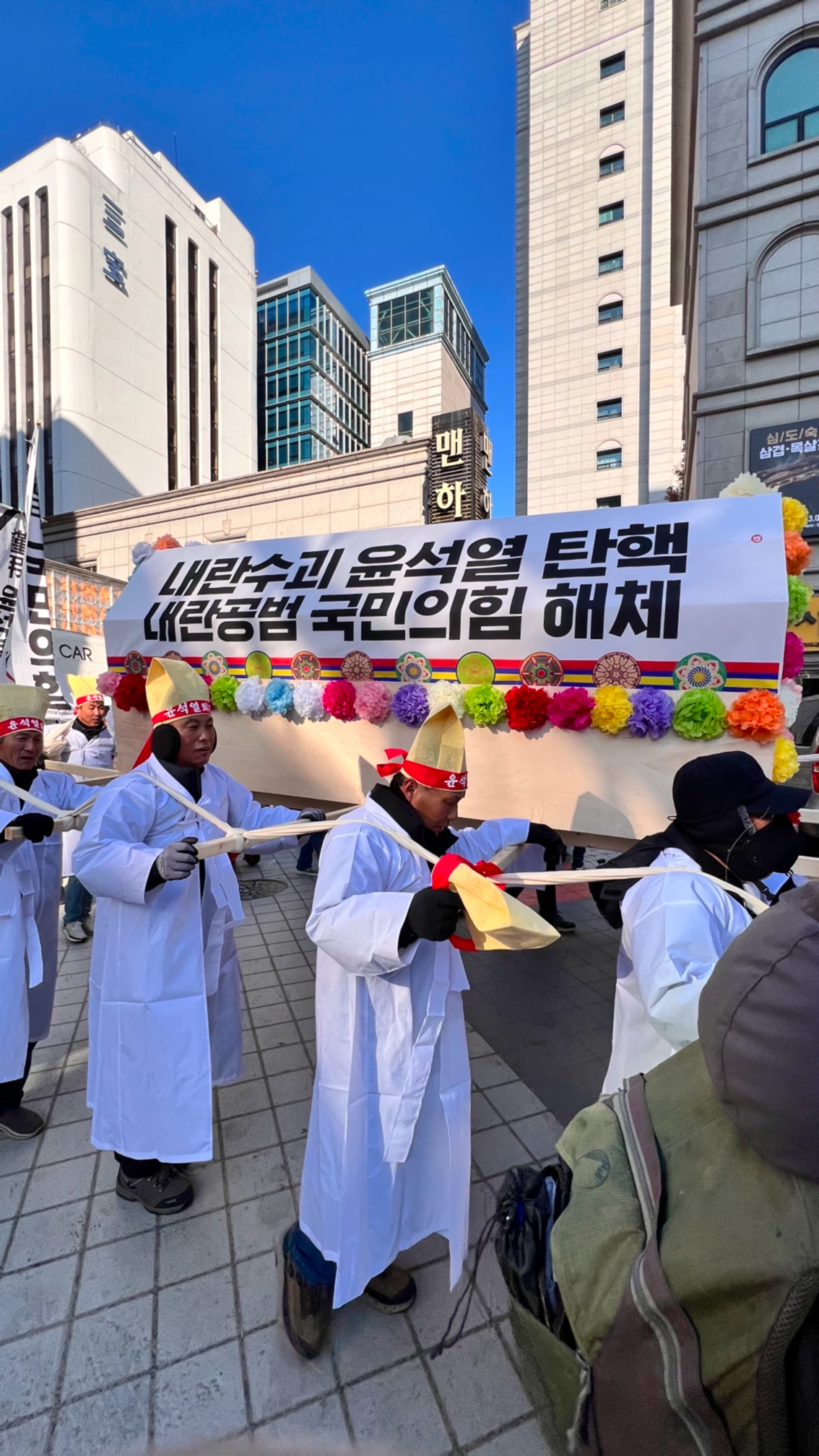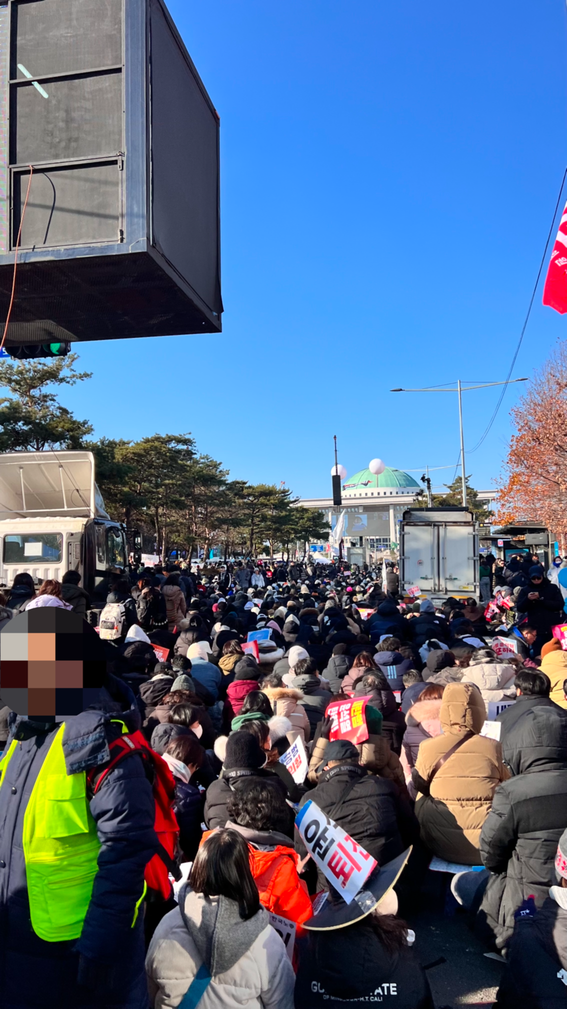 국회의사당역에 내렸다. 원래 늦게라도 참석하려던 개신교 시국 기도회는 이미 끝났나 보다. 국민의 힘 당사 앞에서는 탄핵을 반대하는 사람이 마이크를 쥐고 고래고래 소리를 지르고 있었다. 그 사이로 “내란 수괴 윤석열 탄핵, 내란 공범 국민의 힘 해체”라고 쓴 상여 행렬이 지나갔다. 흰 상복에 누런 삼베 상모까지 갖춰 입고 실제 상여를 운반하듯 곡소리를 내는 퍼포먼스가 눈길을 끌었다. 다시 사람들이 모여 있는 광장으로 갔다. 본 집회는 한 시간 뒤부터지만 이미 사람들로 빼곡히 차 있었다. 앉을 자리를 찾을 수가 없어서 국회 의사당대로 중간에 작은 공원 흙바닥에 준비해 간 방석을 깔았다. 진행자의 구령에 맞춰 “탄핵해! 탄핵해!” 구호도 외치고, 발언 중간중간 손뼉도 치면서 환호했다. 아이들을 데리고 나온 엄마 아빠들, 대학생들, 특히 보랏빛 페미니스트 응원봉을 든 젊은 여성들이 눈에 띄게 많았다. 나도 연명하고 하나 받아왔다.